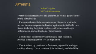 Rheumatoid arthritis is an autoimmune disease that causes inflammation of the joints, tendons, and bones, resulting in pain, swelling, stiffness, and destruction of joints. It is the most common inflammatory arthritis, affecting approximately 1% of the population. The disease is characterized by persistent inflammatory synovitis that leads to damage of cartilage, bone erosion, joint deformity, and disability. It commonly involves small joints of the hands and feet but can also affect larger joints like knees, ankles, and wrists. Symptoms include pain, swelling, and morning stiffness lasting over an hour. Extra-articular manifestations may occur in 30-40% of patients and include rheumatoid nodules, anemia, lung involvement