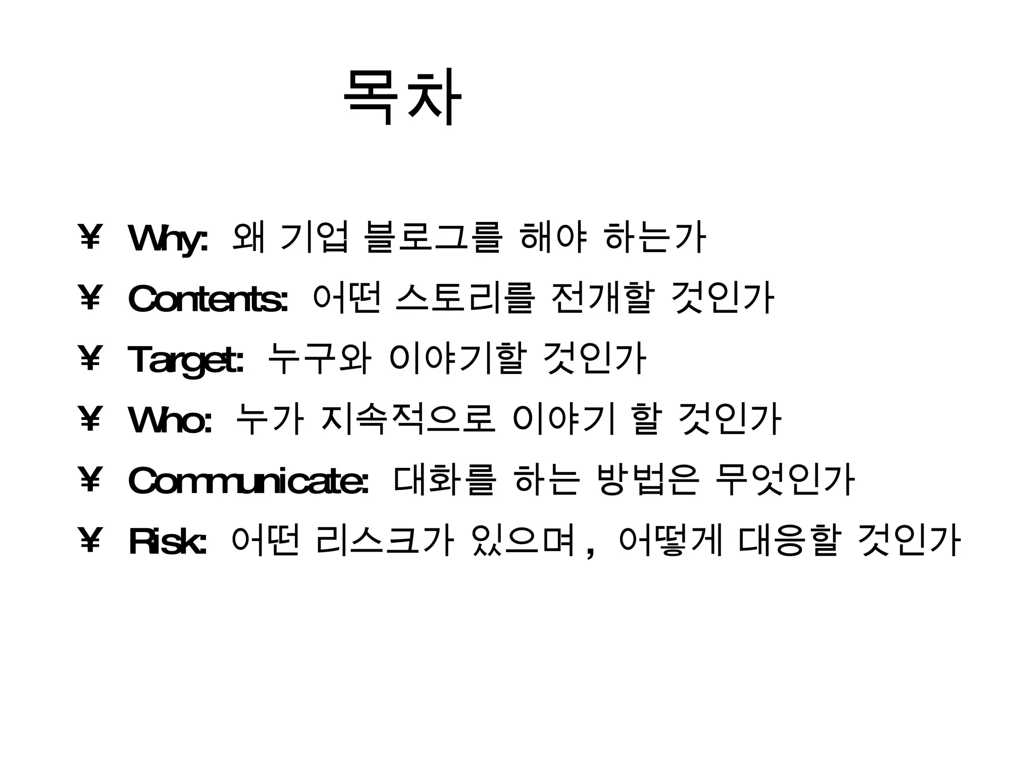 목차 Why: 왜 기업 블로그를 해야 하는가 Contents: 어떤 스토리를 전개할 것인가 Target: 누구와 이야기할 것인가 Who: 누가 지속적으로 이야기 할 것인가 Communicate: 대화를 하는 방법은 무엇인가 Risk: 어떤 리스크가 있으며 , 어떻게 대응할 것인가