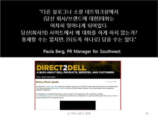 “ 대응하지 않는것은 더 이상 선택할 수 있는 것이 아니다 .” (Not responding is no longer an option) Deloitte Consulting LLP (David Smith & Rob Underwood) Risk: “ 기업들은 지난 몇 세기 동안 자신들의 메시지를 형성하는데 익숙해져 왔다 . 이제 [ 블로그에 힘입어 ] 그들 ( 기업들 ) 은 메시지에 대한 통제 ( 컨트롤 ) 을 잃고 있다” (BusinessWeek)