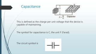 This document defines capacitance as the charge per unit voltage that a device can maintain. It describes a capacitor as a device that can store charge, consisting of two parallel plates separated by a medium like air, vacuum, or dielectric. It provides the equations for capacitance and discusses how capacitors can be arranged in series or parallel circuits. It also describes how capacitors can be used to store energy and discusses dielectrics and their effect on capacitance. Examples are given of calculating charge, capacitance, and capacitor arrangements in circuits.