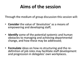 The document summarizes a presentation on creating opportunities for staff development within administrative departments. It discusses using organizational restructuring and job role redefinition to facilitate progression. This involves devolving management responsibilities to empower staff and address skills gaps. Change can motivate but also cause insecurity; successful change requires addressing obstacles, developing new roles, and managing impacts on existing staff. The presentation aims to help delegates address issues in their own workplaces.