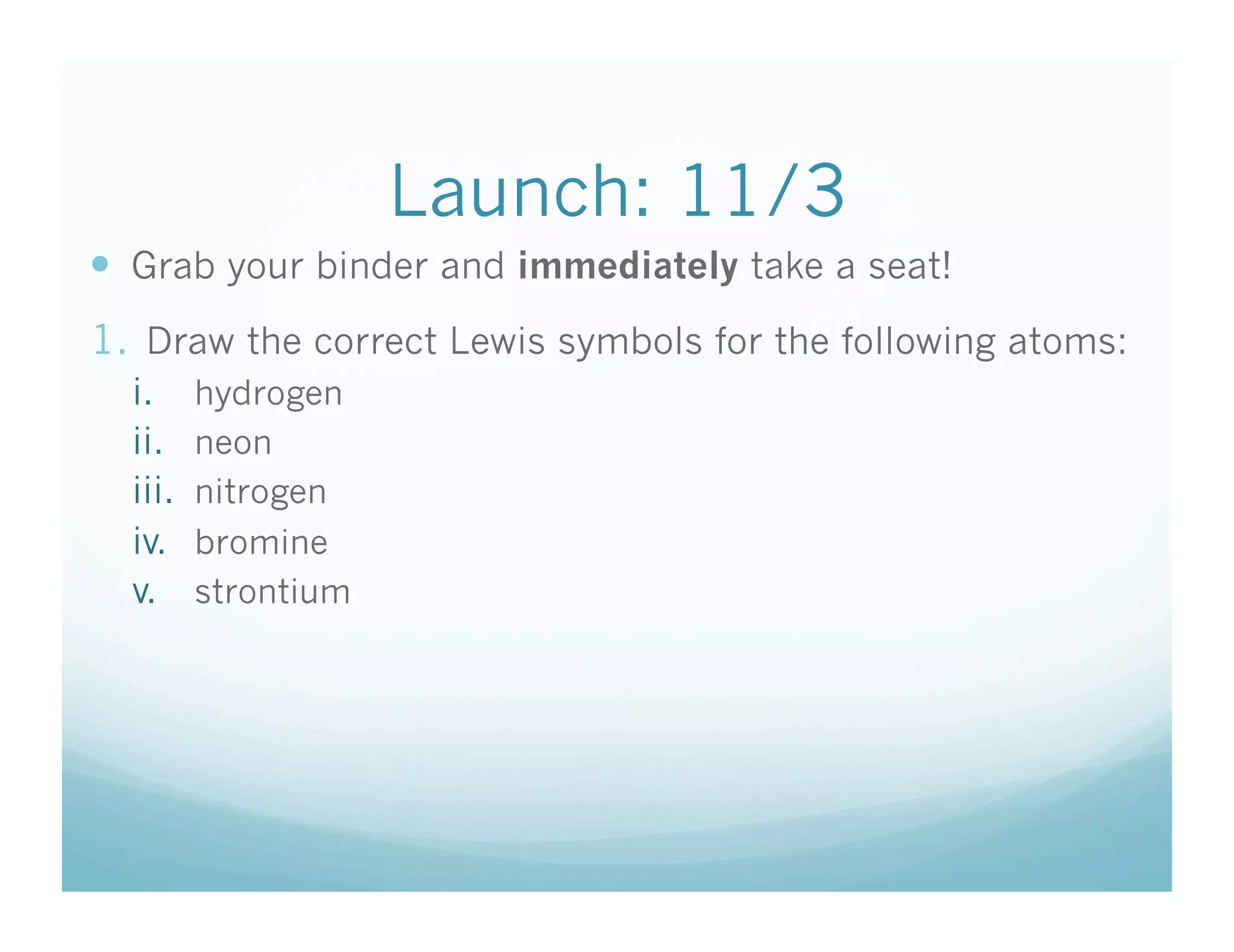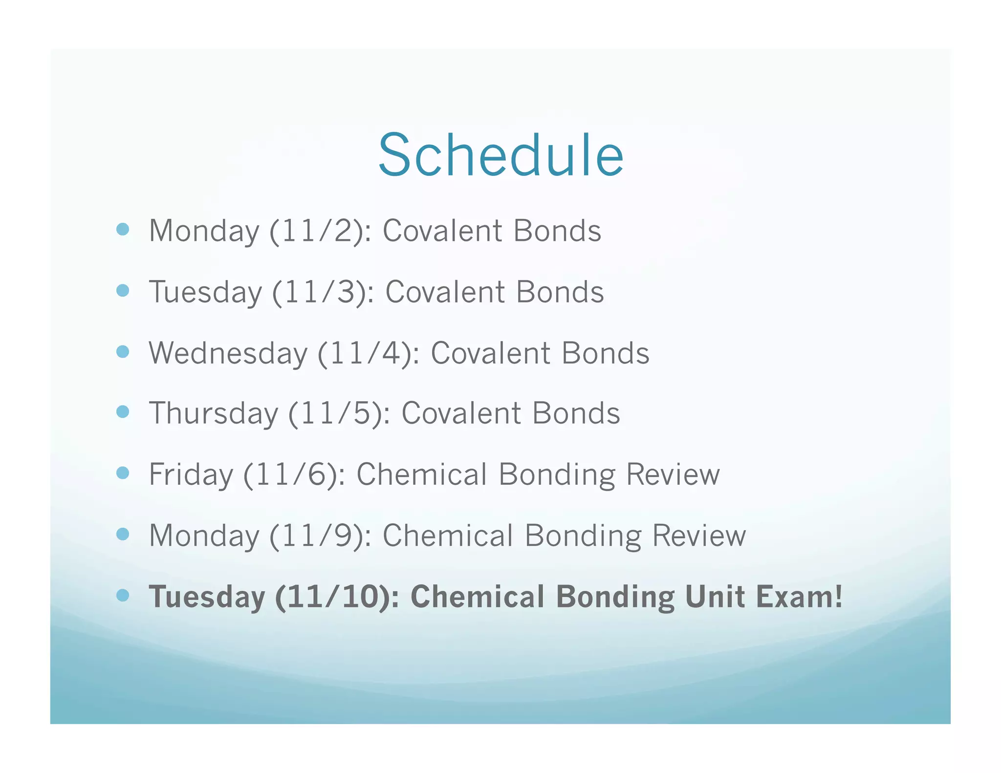 This document provides an agenda and lesson plan for a chemistry class covering covalent bonding and Lewis structures over the course of a week. The schedule lists the daily topics as covalent bonds from Monday to Thursday with a review on Friday and another review the following Monday before a unit exam on Tuesday. The document explains the three step process for drawing Lewis structures: 1) draw Lewis symbols, 2) arrange atoms to achieve a full octet, 3) convert shared electron pairs to bonds. It provides examples of drawing Lewis structures for diatomic molecules like Cl2 and polyatomic molecules like NH3.