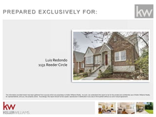This document provides marketing and pricing strategies for selling a home located at 1131 Reeder Circle in Atlanta, GA. It includes a 14-step marketing plan utilizing multiple online and print advertising methods. An analysis compares the home to recent sales in the area. The agents, J.D. Kellum and Nancy Keenan of Keller Williams, promise to actively market the home and navigate the sale process to achieve the best price. They request to meet with the homeowner, Luis Redondo, to develop a personalized plan.
