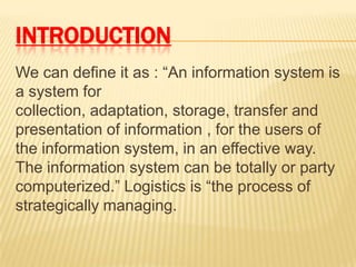 The document discusses logistics information systems and their importance. It defines logistics information systems and explains that they help achieve logistics efficiency, facilitate planning and decision making, improve competitiveness, and interface with other business information systems. The logistics information system is made up of several component information systems, including sales, purchasing, inventory, production, and transportation systems.