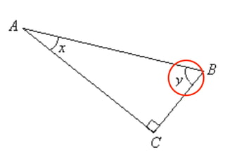 This document provides instructions for using trigonometric functions (sine, cosine, tangent) to solve for unknown sides of a right triangle. It gives an example triangle with a hypotenuse of 9 meters and an angle of 35 degrees. It uses sine to solve for side CB (5.16 m), cosine to solve for side AC (7.37 m), and tangent to solve for the final angle (55 degrees).