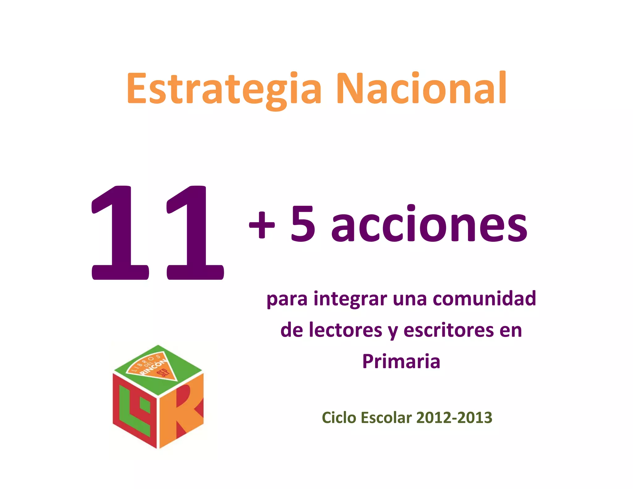 La estrategia nacional propone 11 acciones más 5 actividades permanentes en el aula para integrar una comunidad de lectores y escritores en primaria durante el ciclo escolar 2012-2013. El documento describe las 5 líneas de acción, las responsabilidades del director de la escuela, la integración del comité de lectura y biblioteca, y ofrece un calendario de actividades orientador para fomentar la lectura.