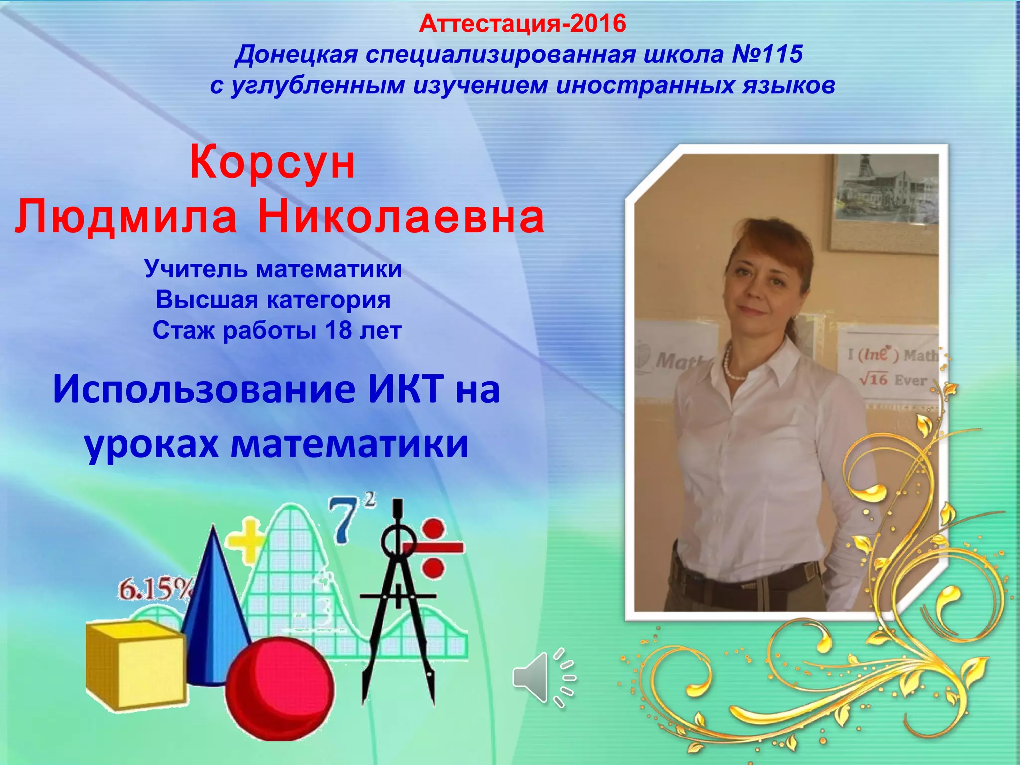 Документ описывает опыт работы Людмилы Корсун, учителя математики, в Донецкой специализированной школе No115, который включает внедрение информационно-коммуникационных технологий (ИКТ) в образовательный процесс. Основной акцент сделан на повышение мотивации учащихся, развитие их творческих и аналитических способностей, а также на создание условий для формирования информационной культуры. Результаты работы показывают качественный рост знаний учащихся и активное участие в математических конкурсах.