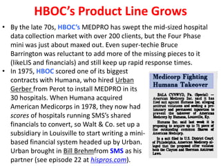 HBOC continued expanding its product line in the late 1970s and 1980s through both internal development and acquisitions. In 1975, HBOC developed its financial system called IFAS to complement its clinical system MEDPRO. In 1981, HBOC acquired Medical Data Corporation, founded by pioneer Ralph Korpman, and its clinical lab system ClinPro. In 1985, two major acquisitions expanded HBOC's offerings significantly - management consulting firm Amherst Associates and mainframe software vendor Mediflex. This catapulted HBOC to the number 2 spot in annual revenue in the hospital information systems industry by the late 1980s.