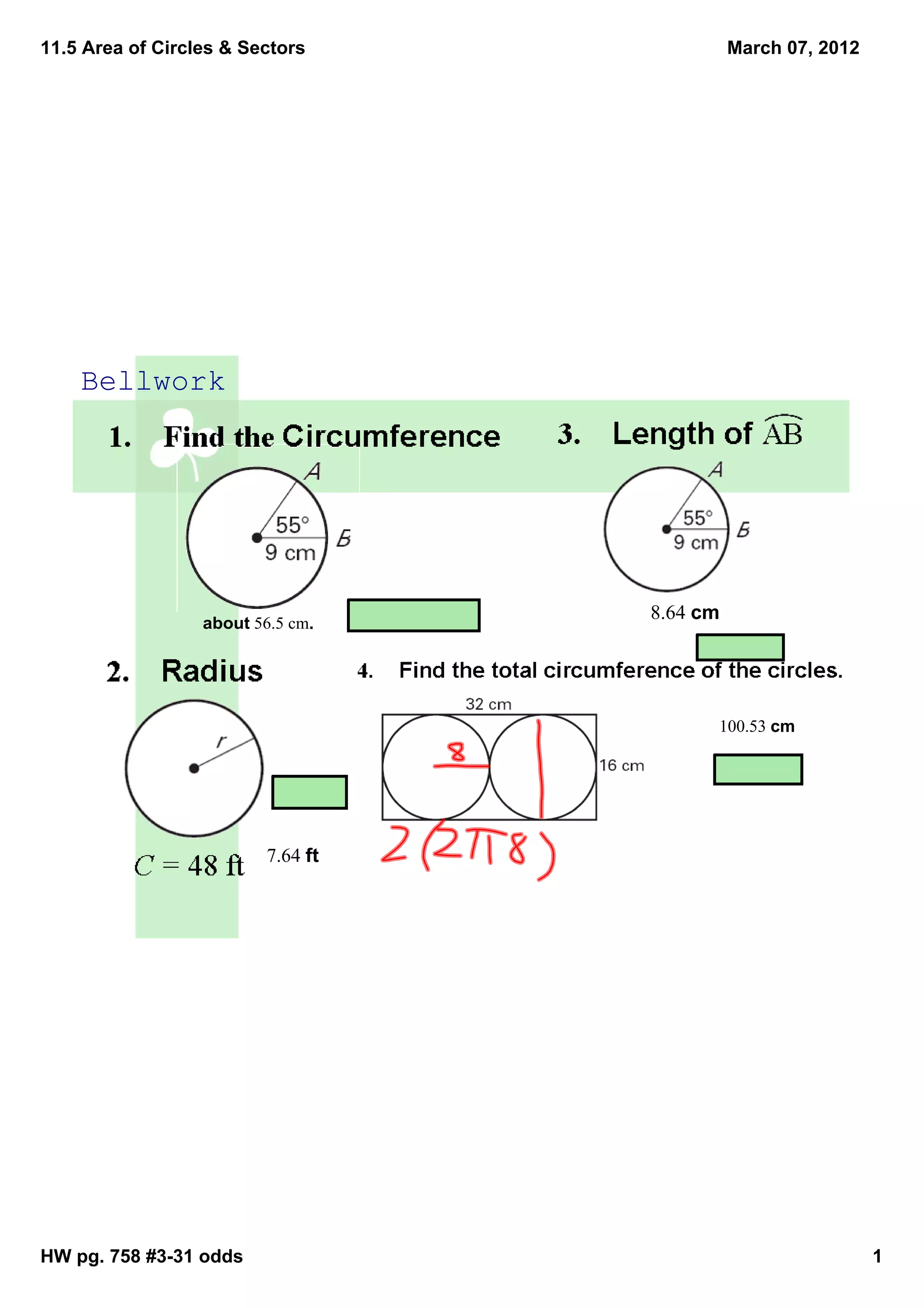 This document discusses formulas and examples for calculating the areas of circles, sectors, segments, and annuli. It introduces the formula for calculating the area of a circle as πr^2. It then provides examples of using this formula, as well as the formula for calculating the area of a sector, which is (portion of the circle) x (area of the circle). The document concludes by assigning homework problems from page 758 numbers 3 through 31 odds.