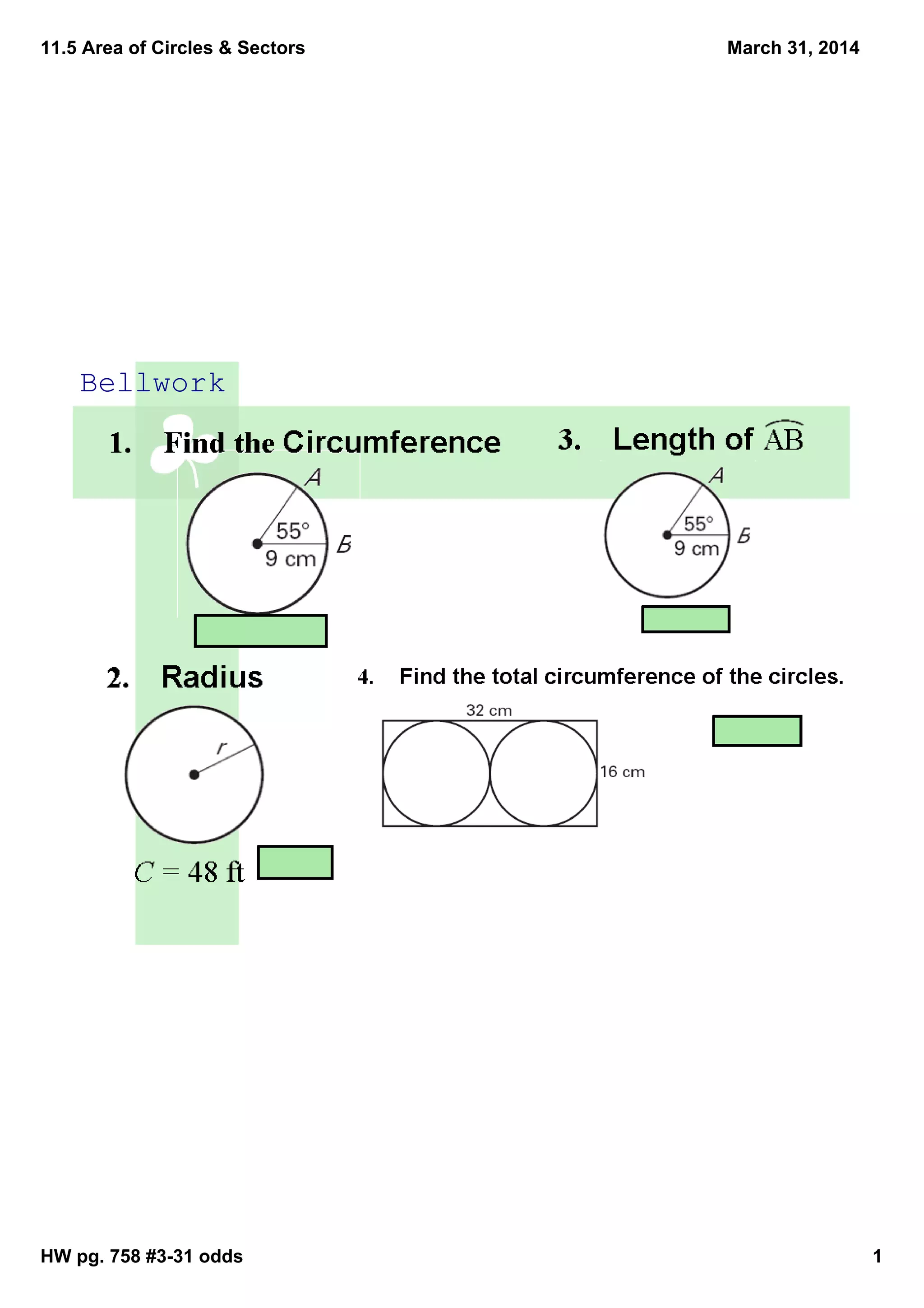 The document contains notes from a math class on the topics of area of circles, sectors, segments and annuli. It includes formulas for calculating these areas, examples of applying the formulas with given values, and practice problems for students to work through. Diagrams illustrate regions such as sectors and segments. The notes provide instruction on key concepts and calculations for finding areas of various parts of circles.