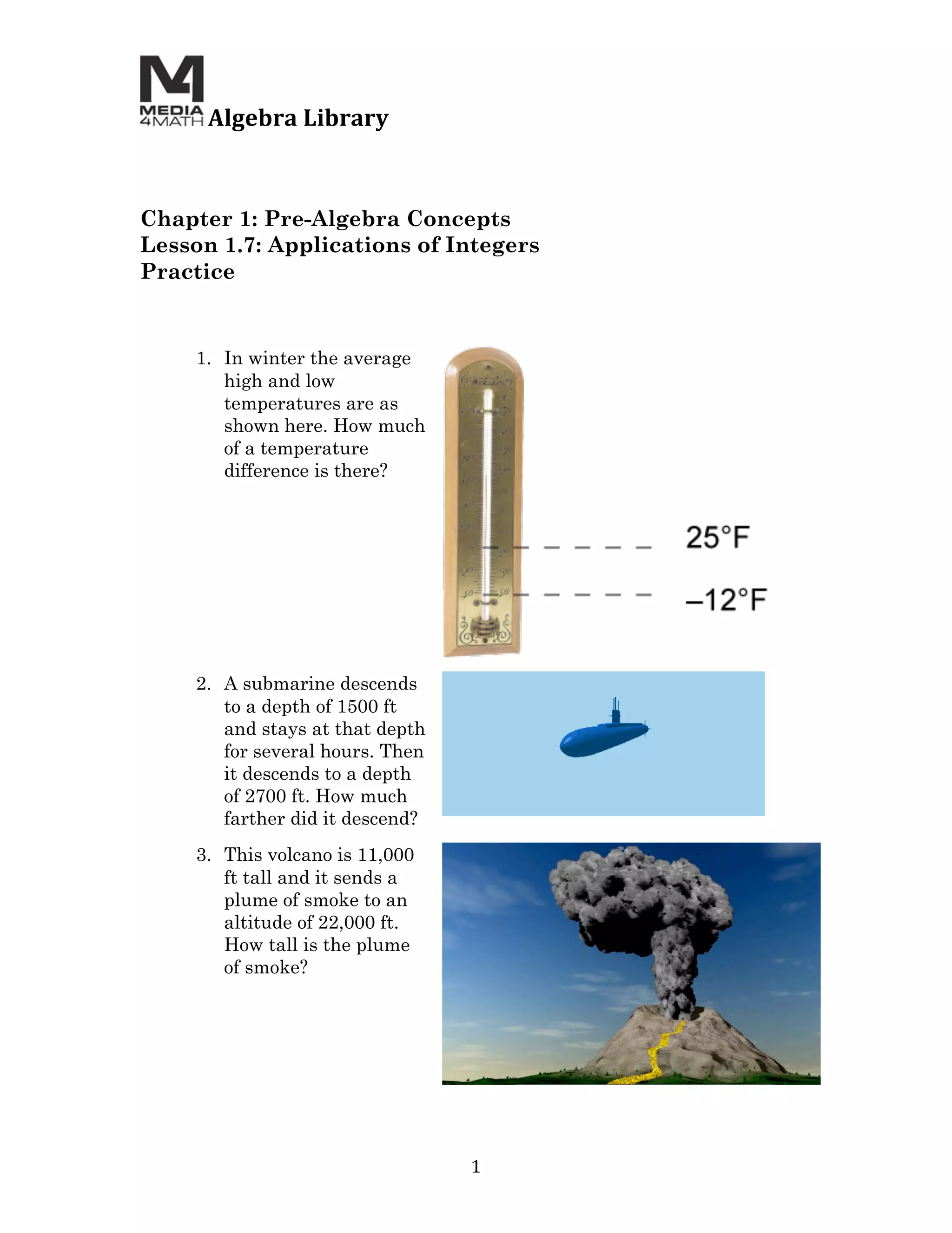 This document is from an algebra library and discusses applications of integers in pre-algebra concepts. It provides 3 practice problems asking about temperature differences, submarine depths, and volcano heights and smoke plumes. The answer key then gives the solutions to each problem as 37°F, 1200 ft, and 11,000 ft respectively.