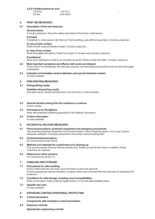 This document provides information on the chemical 3,4,5-Trimethoxybenzoic acid (CAS 118-41-2) including its identification, hazards, composition, safe handling and storage, exposure controls, physical and chemical properties, and toxicological information. It lists this chemical as a skin and eye irritant that may cause respiratory irritation. Proper protective equipment is recommended when handling this product.
