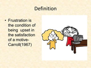 This document discusses frustration and conflicts. It defines frustration as the denial or upsetting of a goal-directed behavior. Sources of frustration include the physical environment, socio-cultural environment, personal inadequacy, and background stressors. Responses to frustration include aggressive reactions, withdrawal reactions, and defense mechanisms. Conflict is described as a state of tension between incompatible desires that cannot be fully satisfied at the same time. Types of conflict include interpersonal, person vs environment, and intrapersonal. Approaches include approach-approach, avoidance-avoidance, approach-avoidance, and multiple approach-avoidance conflicts. Unconscious conflicts also arise from Freud's concepts of the id, ego and superego.