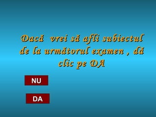 Documentul sugerează că, pentru a obține informații despre tema examenului următor, trebuie să se apese pe o opțiune specifică. De asemenea, se subliniază importanța învățării correcte în locul obținerii subiectului direct. În concluzie, documentul încurajează studiul activ.