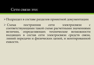 Документ описывает проектирование объектов связи в рамках промышленного и гражданского строительства, включая нормативные акты и различные виды сетей связи, такие как телефонные и сети передачи данных. Он также включает схемы организации сети, графические обозначения и деление на узлы и линии связи. Основное внимание уделяется требованиям проектной документации и нормам проектирования для обеспечения технической возможности сетей.