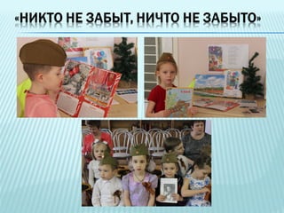 Проект «никто не забыт, ничто не забыто» направлен на воспитание патриотизма у детей через изучение истории Великой Отечественной войны. В проекте участвуют дети, родители и воспитатели, которые занимаются различными образовательными и творческими активностями, такими как выставки, конкурсы и чтение художественной литературы. Цель проекта — формирование уважения к подвигам ветеранов и сохранение памяти о событиях войны.