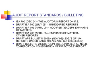 This document summarizes various audit reporting standards and bulletins. It includes examples of unmodified audit reports, modified reports that include disagreements, uncertainties and scope limitations, as well as emphasis of matter and other matter paragraphs. It also discusses auditor responsibilities in relation to listed company reporting and reviews of financial statements.