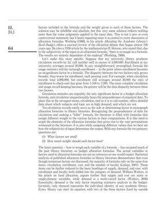 Budget allocation formulas claim objectivity but introduce subjectivity through assigning weights to factors. The key factors considered are supply, demand, and cost, but cost data is often not specific to an individual library. Circulation data best reflects the actual demand at a library but is rarely the sole factor. Formulas produce unexpected results that do not match librarian expectations, demonstrating the illusion of objectivity from formulas.