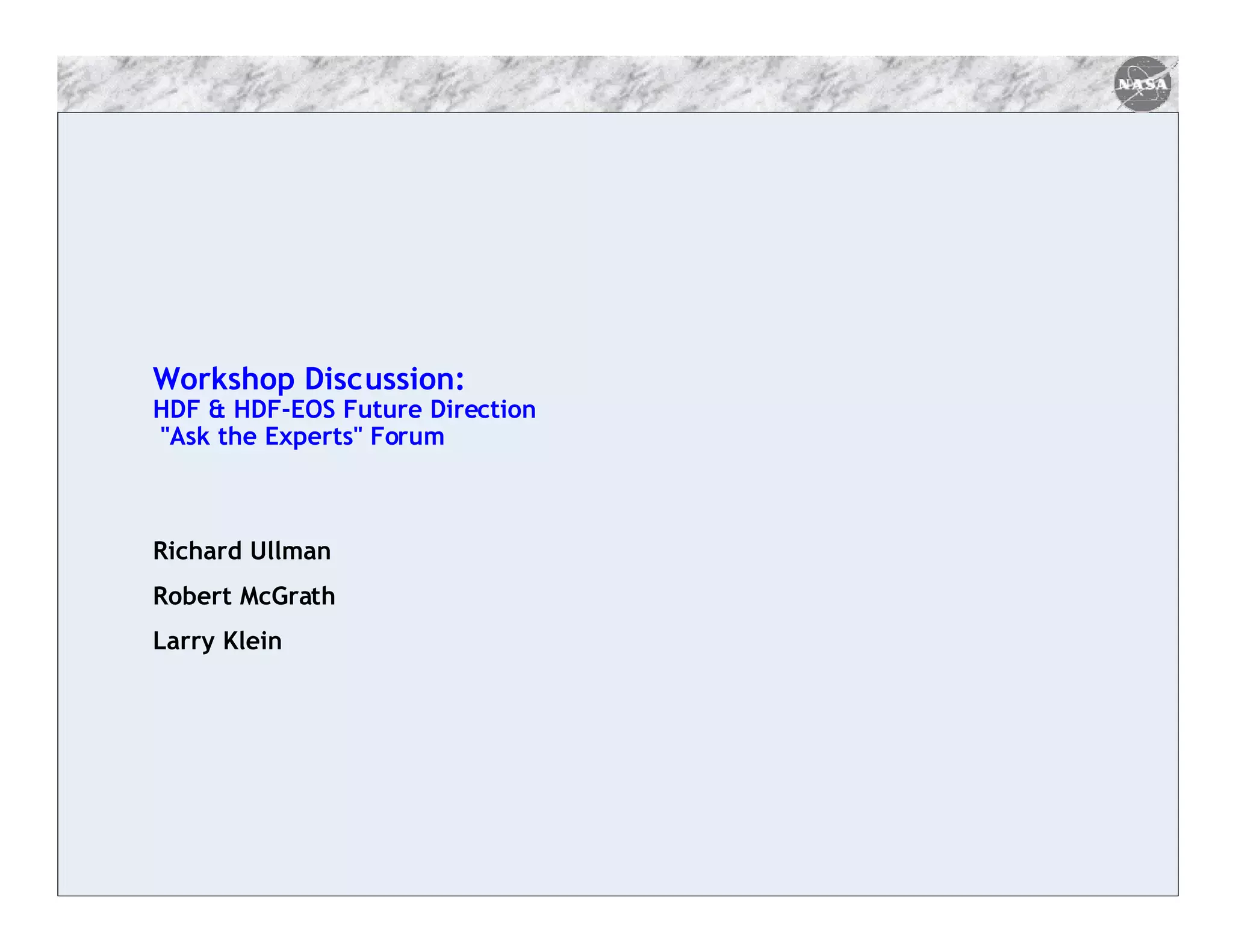 The workshop focused on the future directions of HDF and HDF-EOS, emphasizing the need for community-driven data standards and better collaboration among data providers. Participants discussed user frustrations regarding data access and tools, necessitating improved resources and introductory materials for data formats. Key issues included the importance of interoperability, adequate funding for tool development, and the need for effective communication between users and producers to evolve standards.