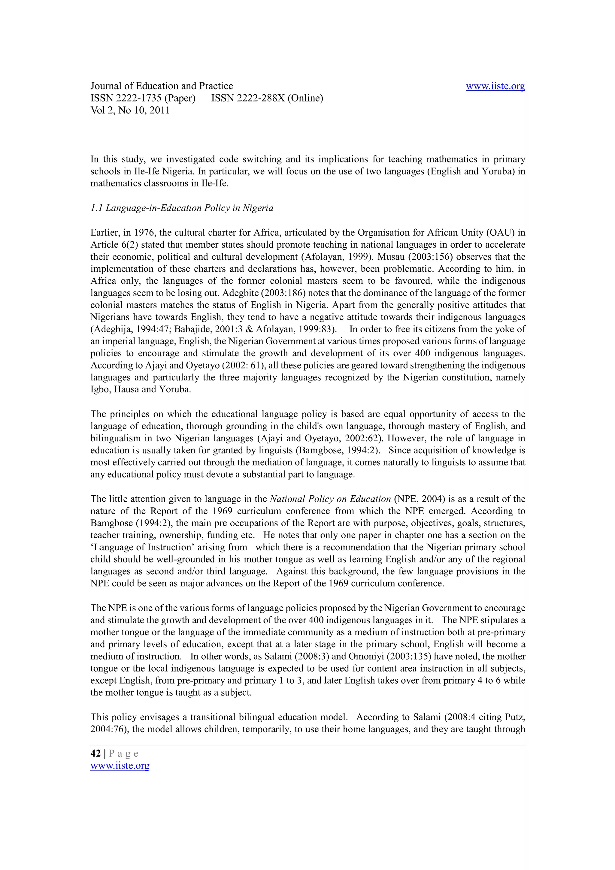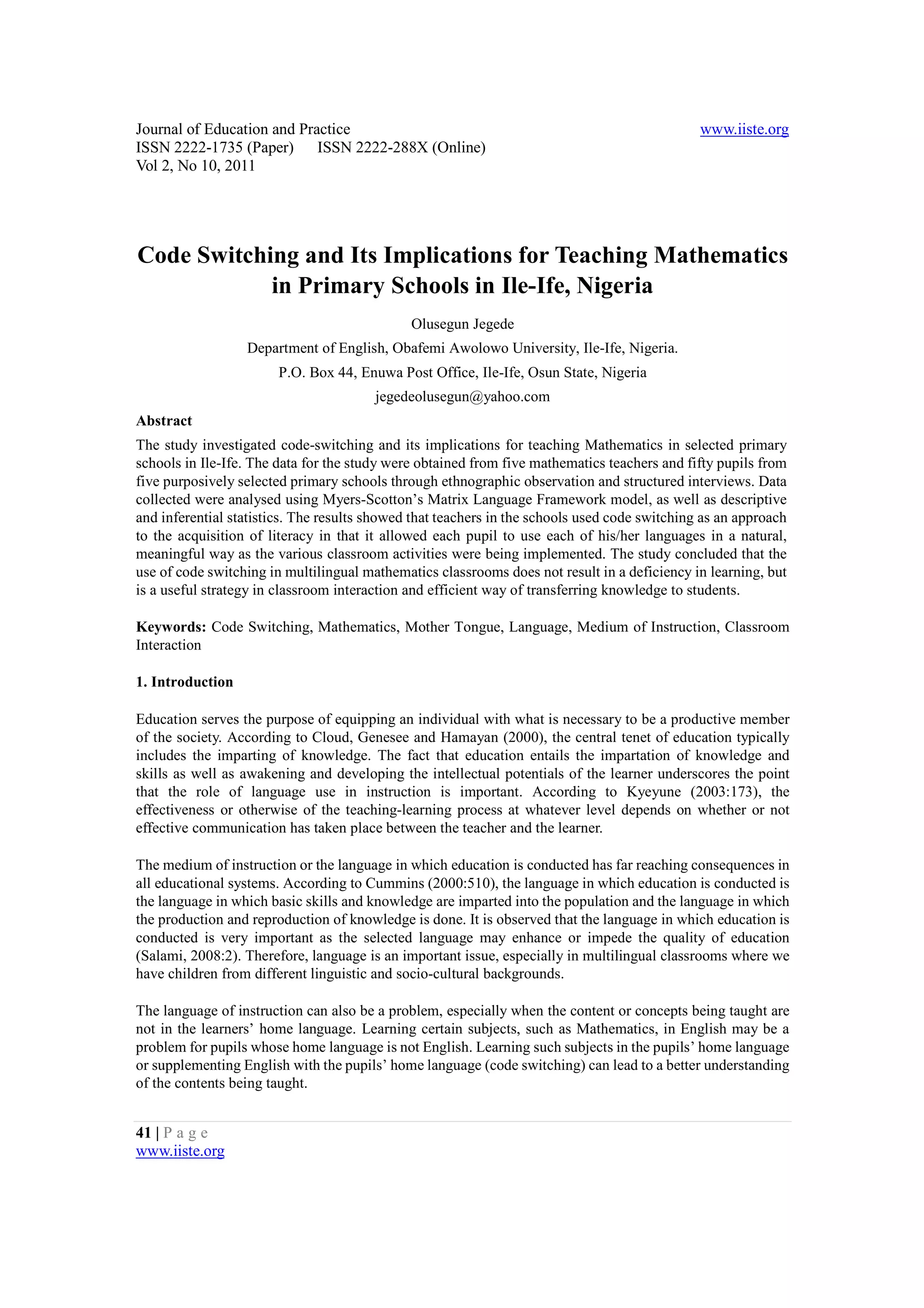 This study investigated code switching between English and Yoruba languages in mathematics classrooms in primary schools in Ile-Ife, Nigeria. The researcher observed mathematics lessons and interviewed teachers and students. The results showed that teachers used code switching to help students understand mathematical concepts by explaining terms in both English and their native Yoruba language. Students performed better in mathematics when teachers used code switching. The study concluded that code switching is an effective teaching strategy in multilingual classrooms that does not negatively impact learning, but rather helps transfer knowledge to students.