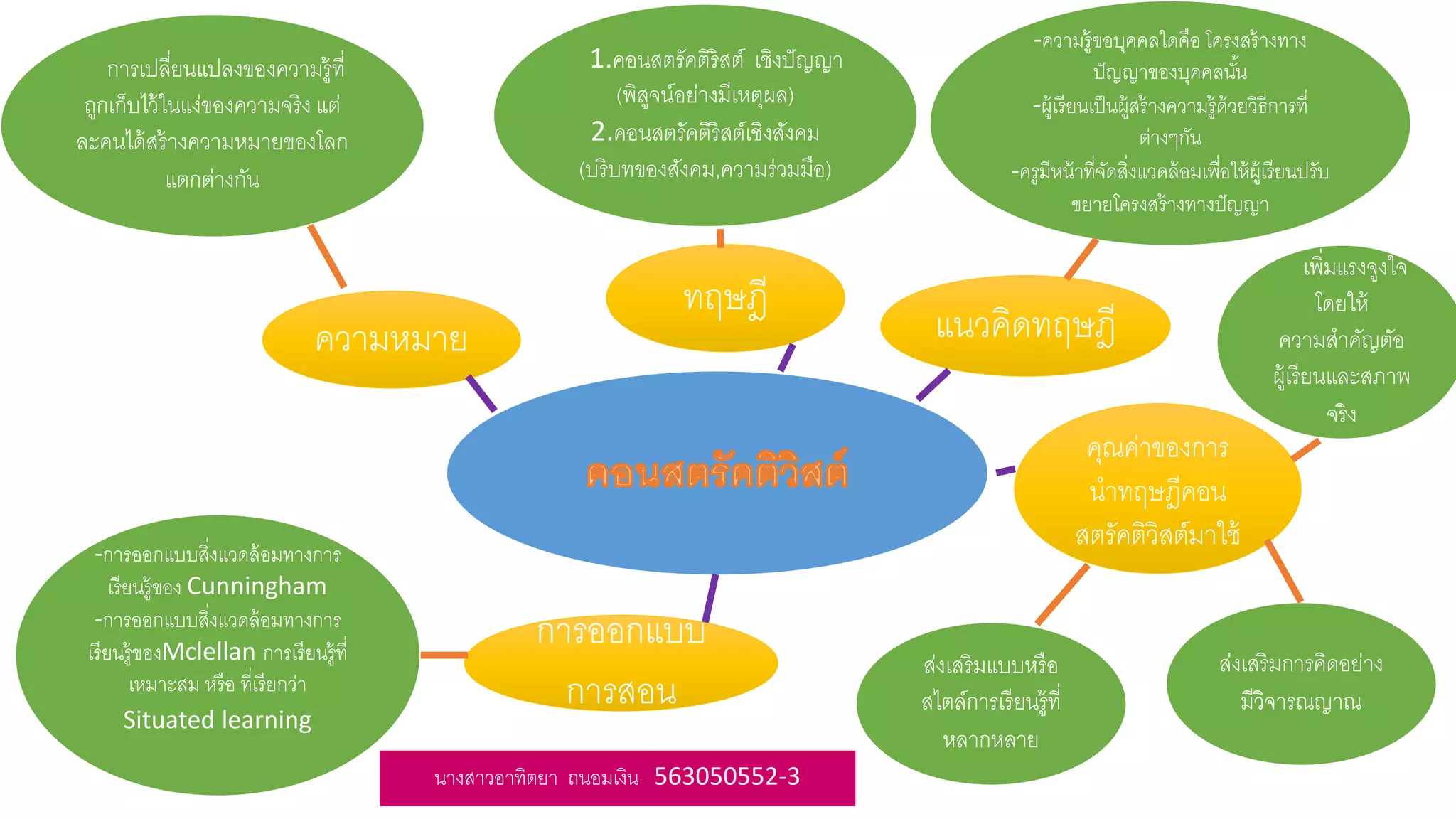 เชิงปัญญา (พิสูจน์อย่างมีเหตุผล) 2.คอนสตรัคติริสต์เชิงสังคม (บริบทของสังคม,ความร่วมมือ) คุณค่าของการ นําทฤษฎีคอน สตรัคติวิสต์มาใช้ ส่งเสริมการคิดอย่าง มีวิจารณญาณ เพิ่มแรงจูงใจ โดยให้ ความสําคัญตัอ ผู้เรียนและสภาพ จริง ส่งเสริมแบบหรือ สไตล์การเรียนรู้ที่ หลากหลาย การออกแบบ การสอน -การออกแบบสิ่งแวดล้อมทางการ เรียนรู้ของ Cunningham -การออกแบบสิ่งแวดล้อมทางการ เรียนรู้ของMclellan การเรียนรู้ที่ เหมาะสม หรือ ที่เรียกว่า Situated learning นางสาวอาทิตยา ถนอมเงิน 563050552-3