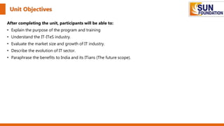 This training program aims to impart skills to individuals wishing to become web developers. Upon successful completion and passing an assessment, participants will receive a certificate qualifying them for entry-level IT roles. The document provides an overview of the objectives, which include explaining the purpose and scope of the IT industry in India. It discusses the evolution and growth of the Indian IT sector, highlighting its advantages and the opportunities in newer geographies and verticals. The growing market size of the Indian IT industry is also presented, expected to reach $350 billion by 2025.