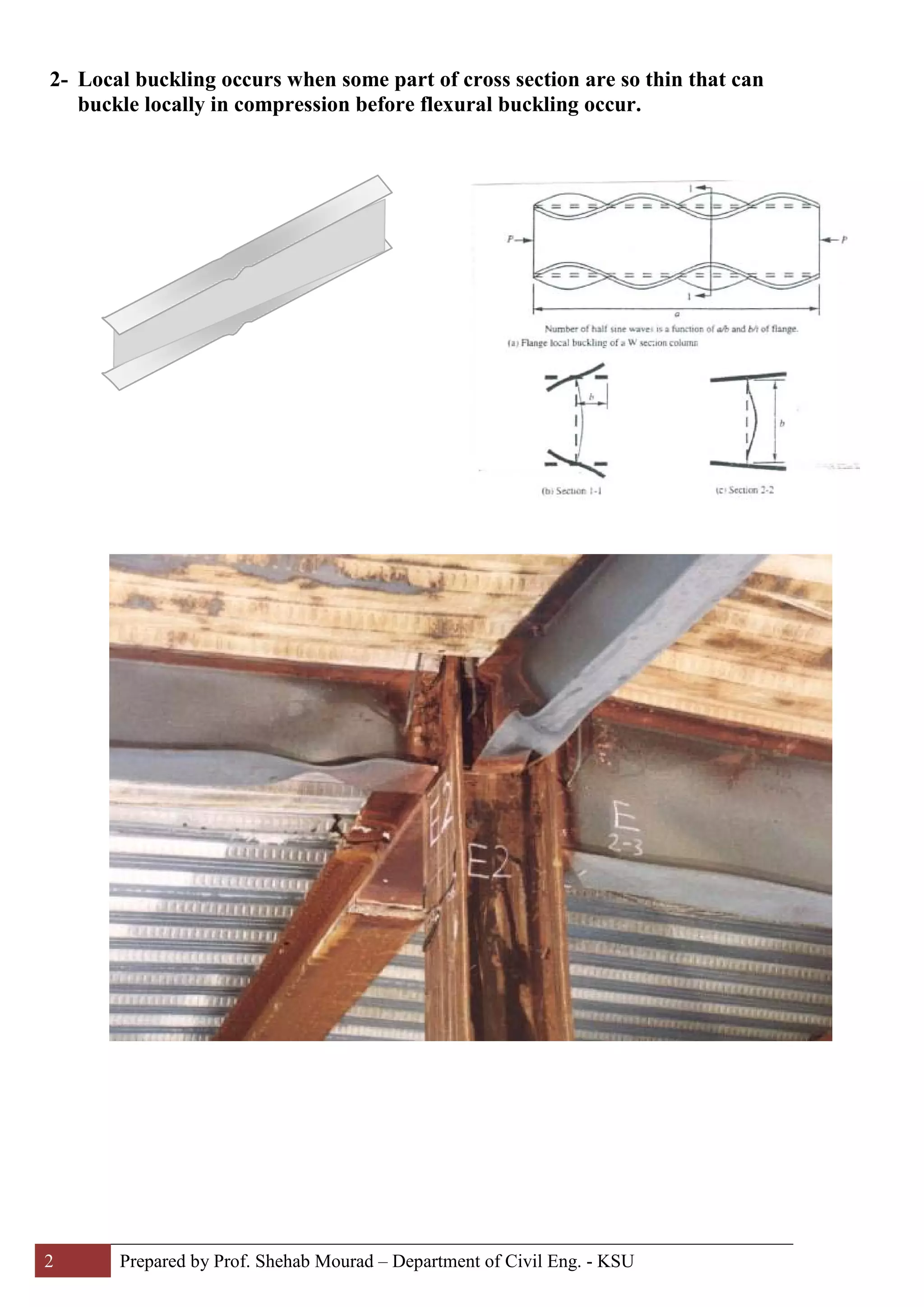 This document discusses axially compressed members and their failure modes. Compression members can fail due to flexural buckling, local buckling of the cross section, or torsional buckling. Flexural buckling, also called Euler buckling, depends on the member's slenderness ratio and is analyzed using the Euler formula. Local buckling occurs when parts of the cross section are too thin. Torsional buckling happens in members with eccentric shear centers. The document also provides formulas to calculate the buckling load and capacity of compression members based on their cross section properties and dimensions.