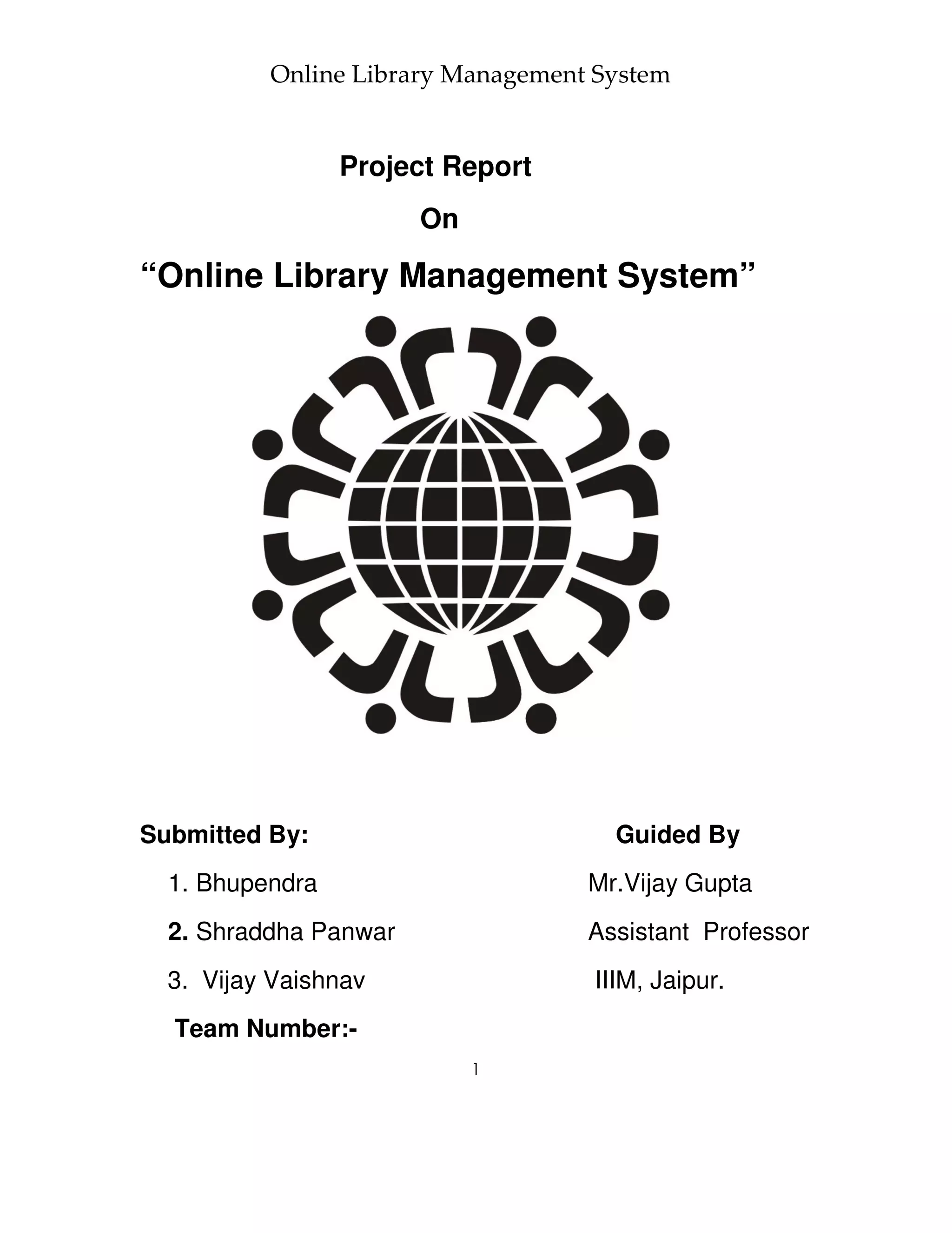 The document outlines a project to develop an Online Library Management System to automate library operations such as membership registration and book management. A team of three students created the system under faculty
