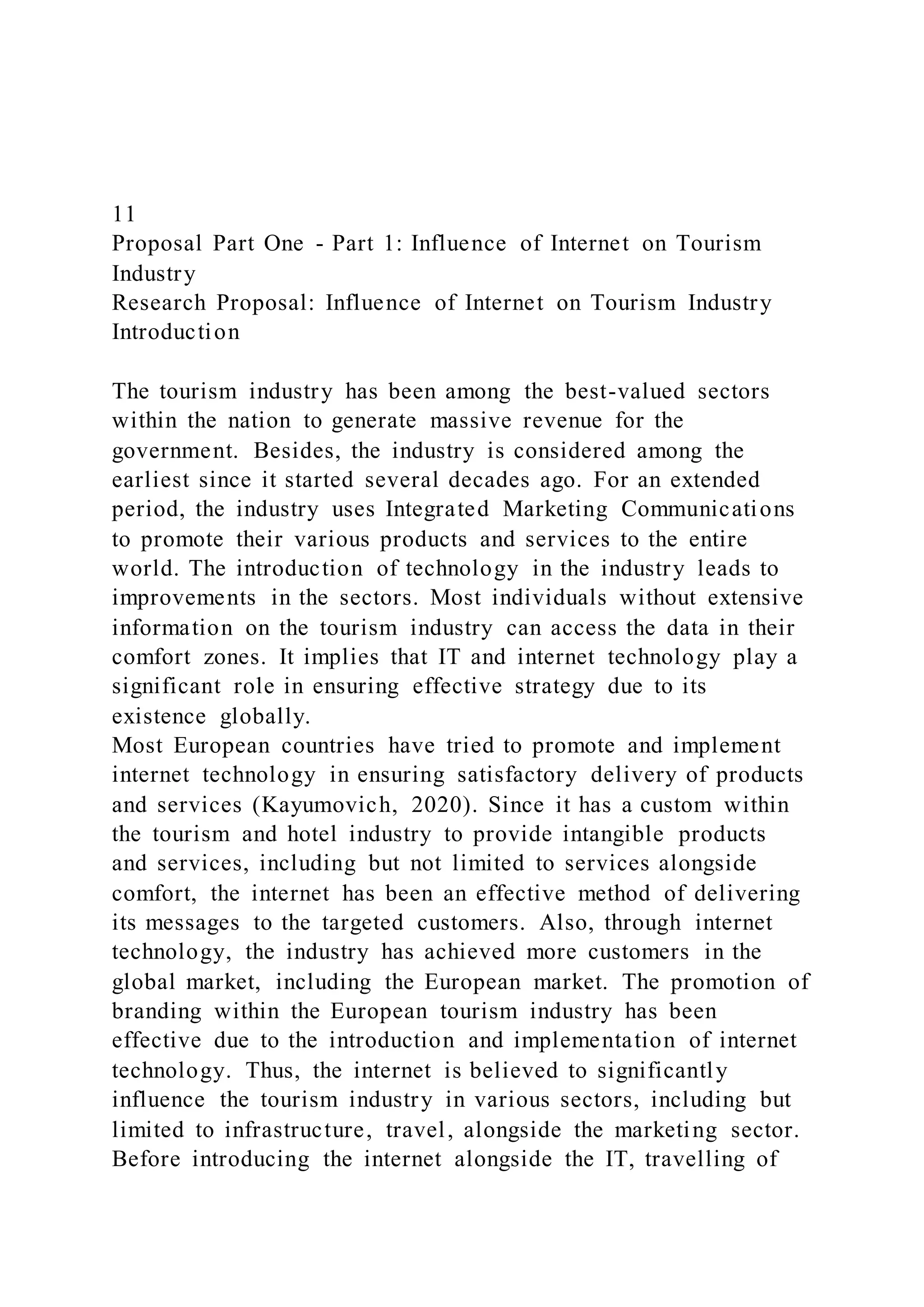 The proposal explores the significant influence of internet technology on the tourism industry, particularly in European countries, highlighting its role in marketing, customer engagement, and distribution. It asserts that the internet has transformed travel planning and booking processes, making them more convenient and accessible for consumers while also increasing the industry's revenue. The research aims to identify both the benefits and challenges of internet integration in tourism, emphasizing the necessity for further studies on evolving technologies within the sector.