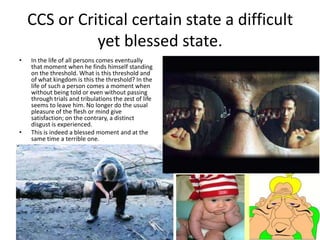 This document discusses the concept of a "critical certain stage" or threshold that some people reach in life. It describes this moment as when pleasure from worldly things no longer satisfies and a distinct disgust is experienced. It can come unconsciously for some, while others must earn this moment. The document emphasizes that this is a blessed yet difficult moment, and those who do not understand its significance may miss an important opportunity for growth. Later passages discuss factors like breathing, food, senses and sleep/inertia that influence a person's system, and how being relative to one's position regarding the threshold shapes perspectives on life, consciousness, truth and religion. It notes this book is not intended for those who have already crossed the threshold and become