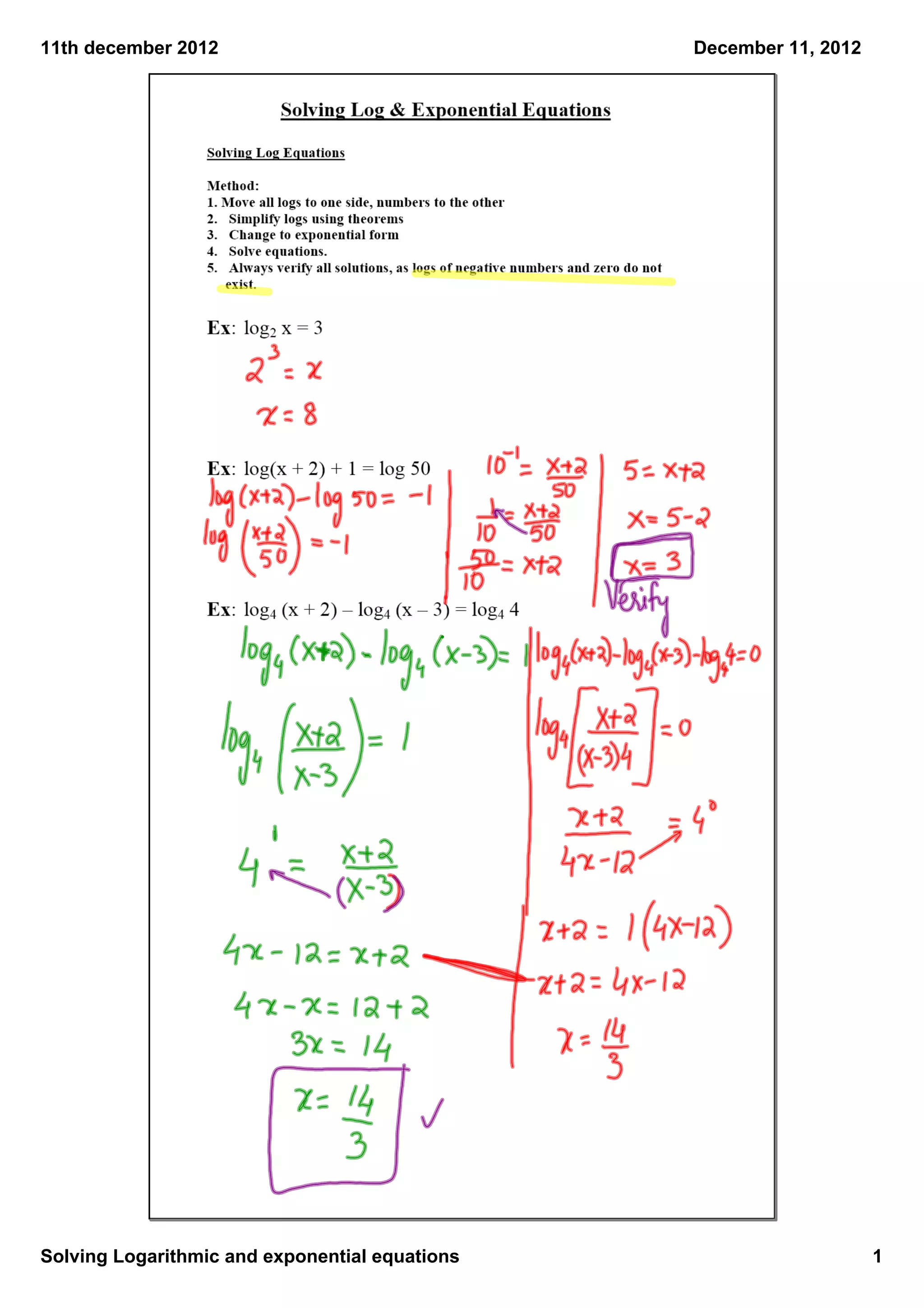 The document is a 7-page guide dated December 11, 2012 about solving logarithmic and exponential equations. It provides instructions over multiple pages on evaluating and solving various logarithmic and exponential expressions and equations through algebraic manipulation and properties of logarithms and exponents.