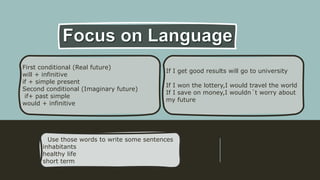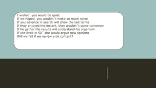 This document discusses different types of adverbs in English including adverbs of manner, place, time, frequency, and degree. It provides examples for each type of adverb and explains how they are used to modify verbs, adjectives, other adverbs, and entire sentences. Common adverbs like quickly, here, tomorrow, always, and very are given as examples to illustrate how each category answers questions about an action.