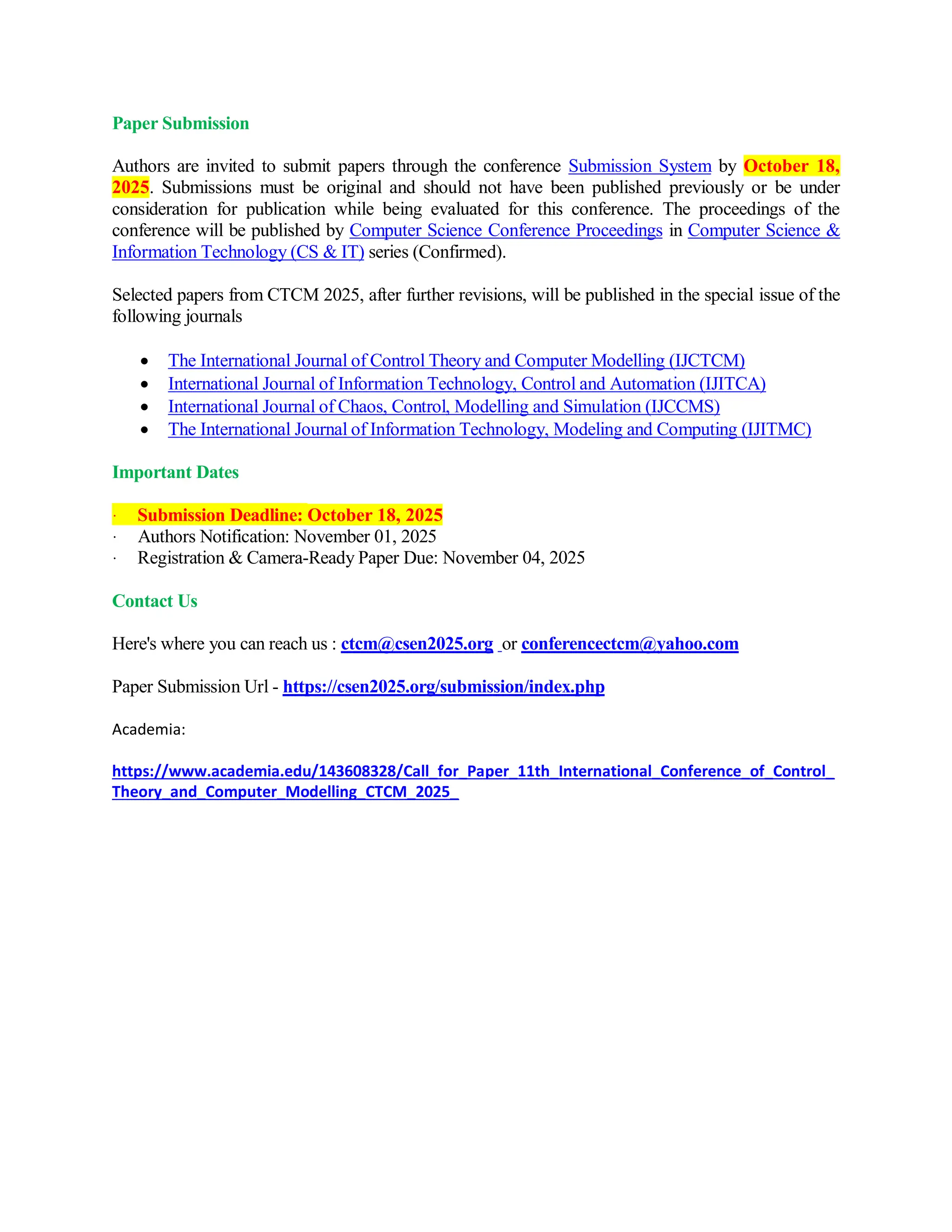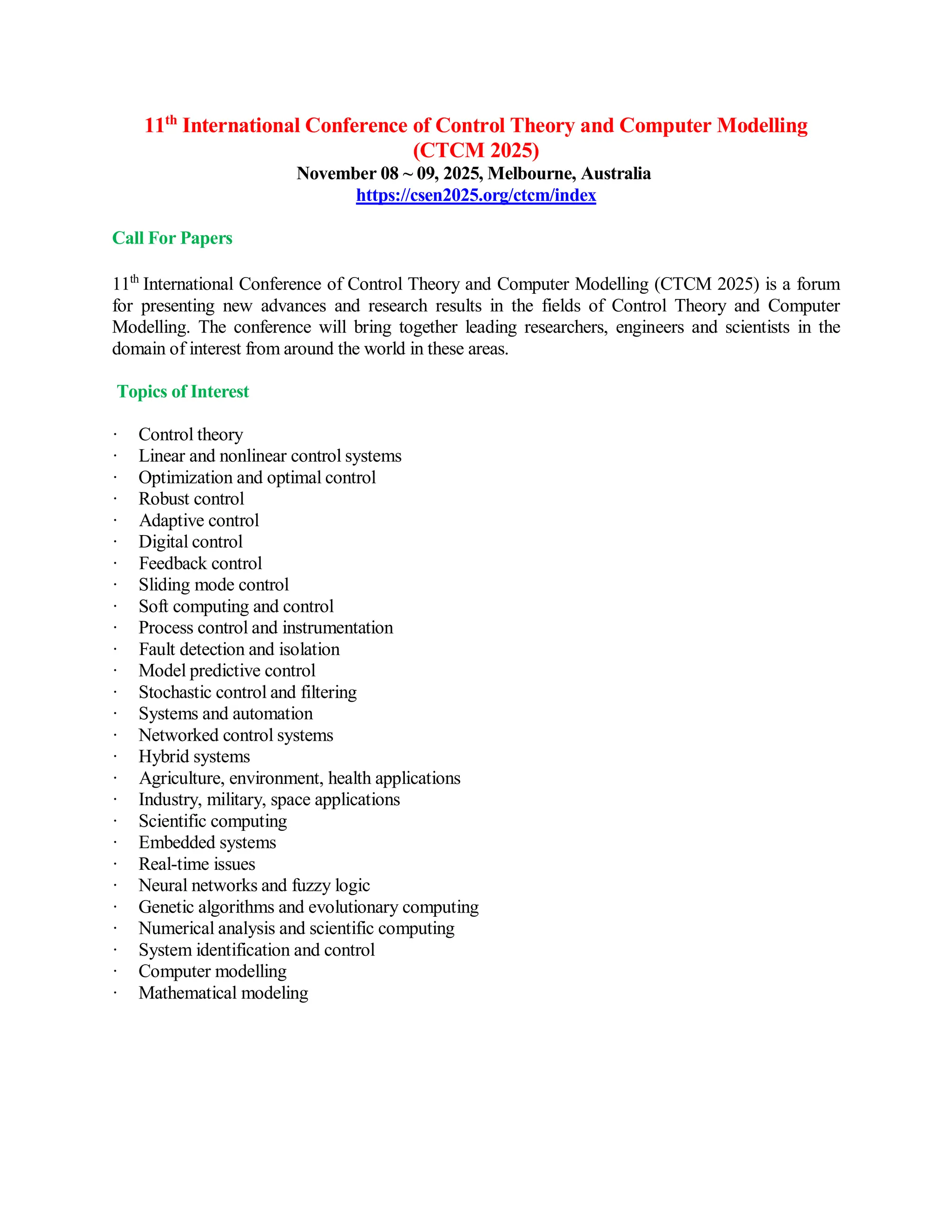 11th International Conference of Control Theory and Computer Modelling (CTCM 2025) is a forum