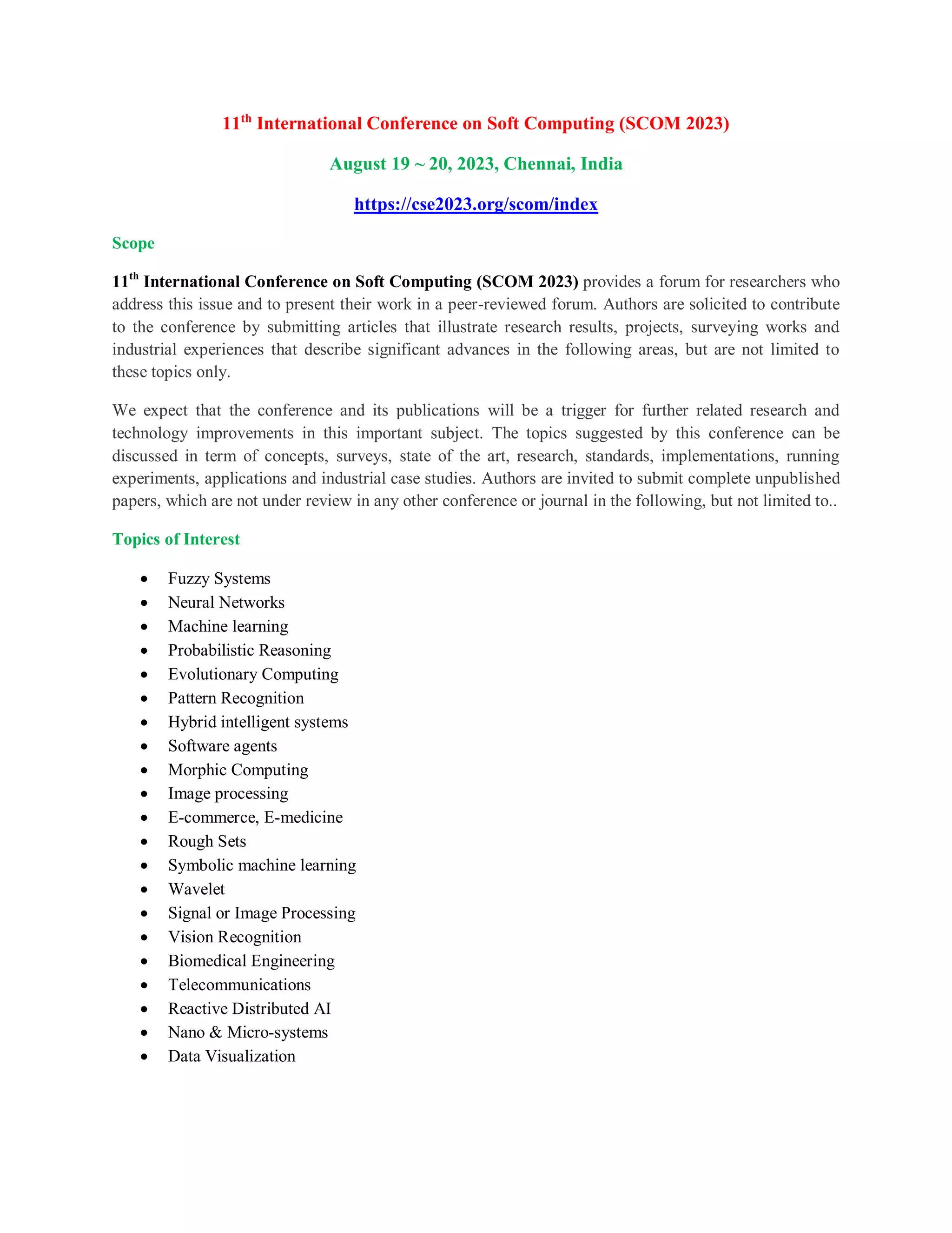 The document announces the 11th International Conference on Soft Computing (SCOM 2023) to be held in Chennai, India from August 19-20, 2023. It invites authors to submit unpublished papers on topics related to soft computing including fuzzy systems, neural networks, machine learning, and others. The submission deadline is May 20, 2023 with notifications on June 24 and final papers due on July 1. Selected papers will be published in conference proceedings and considered for publication in related journals.
