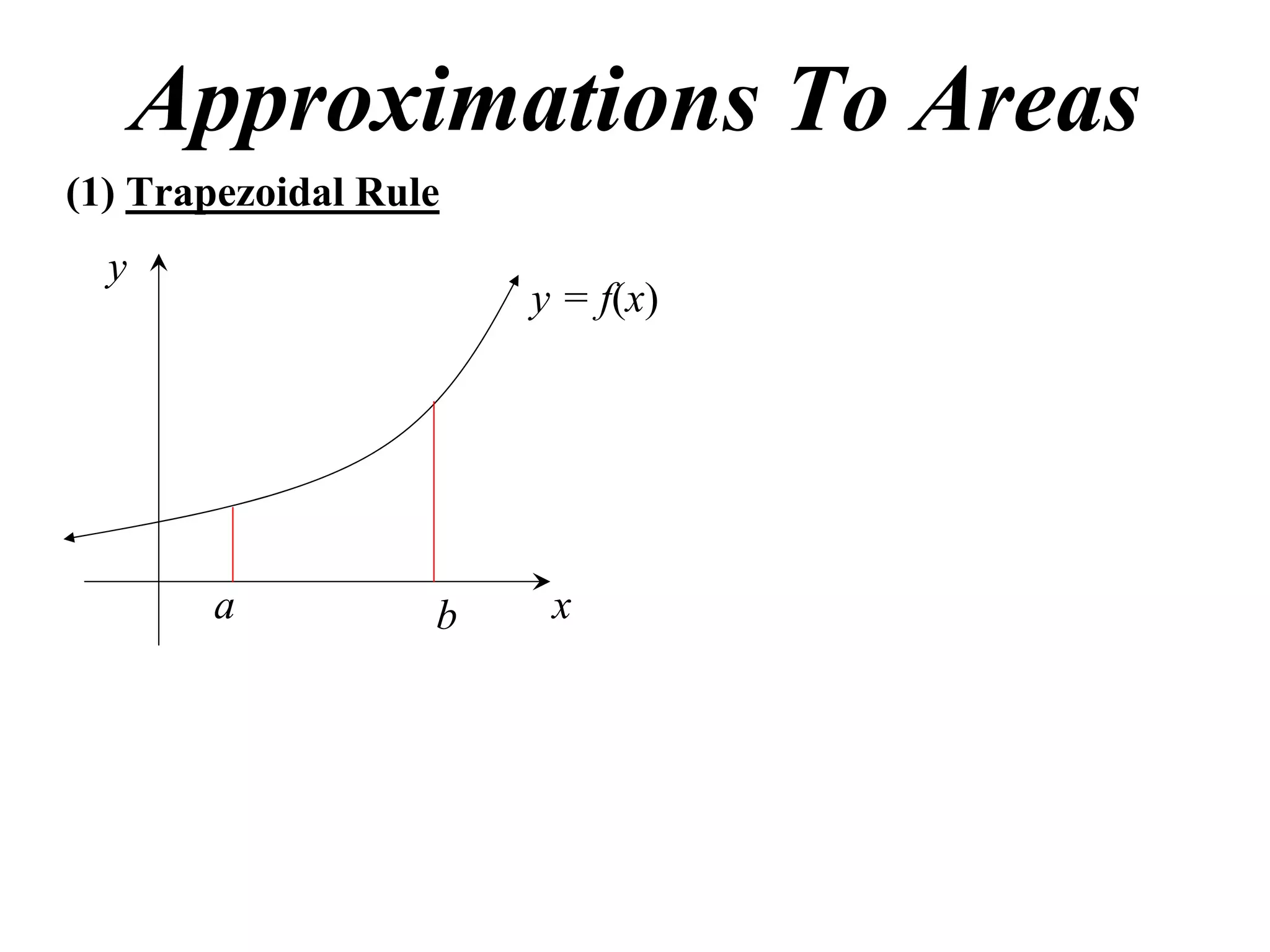 The document describes the trapezoidal rule for approximating the area under a curve. The trapezoidal rule works by dividing the area into trapezoid sections and summing their individual areas. In general, the area is approximated as the average of the initial and final y-values plus twice the sum of the internal y-values, divided by the number of sections. An example applies this to estimate the area under a given curve divided into 4 intervals.