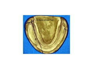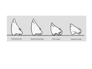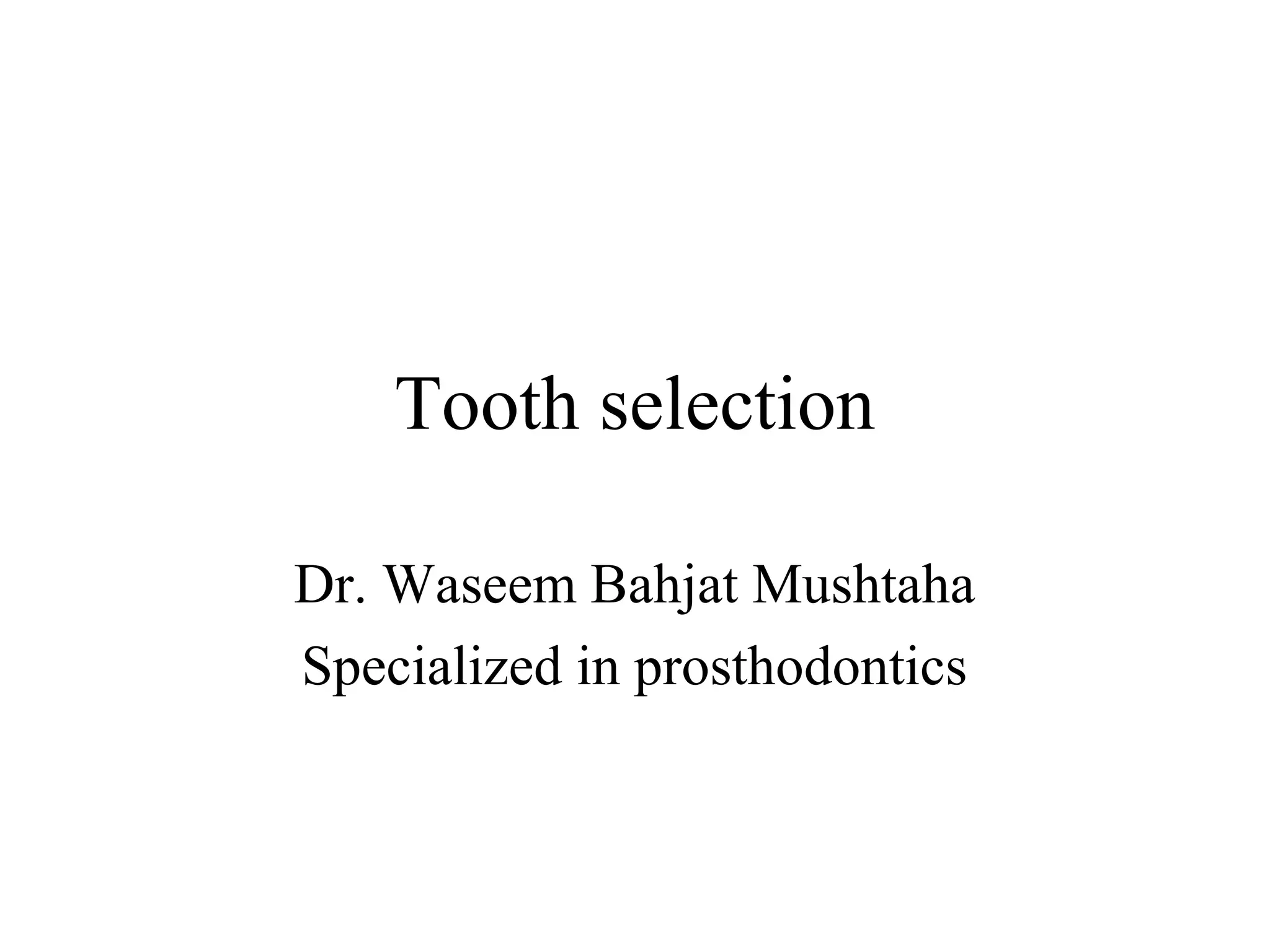 This document discusses tooth selection for complete dentures. It covers selecting anterior teeth based on size, form, and shade to satisfy esthetic requirements, as well as selecting posterior teeth based on shade, size, number, and form to satisfy masticatory functions. Factors considered for anterior tooth selection include the size of the face, location of cuspid eminences, vertical distance between ridges, and lip line. Form is selected based on face form, sex, and dental arch shape. Shade matches the skin, hair, eyes and patient's age. Posterior teeth are selected to support cheeks and tongue while functioning in mastication.