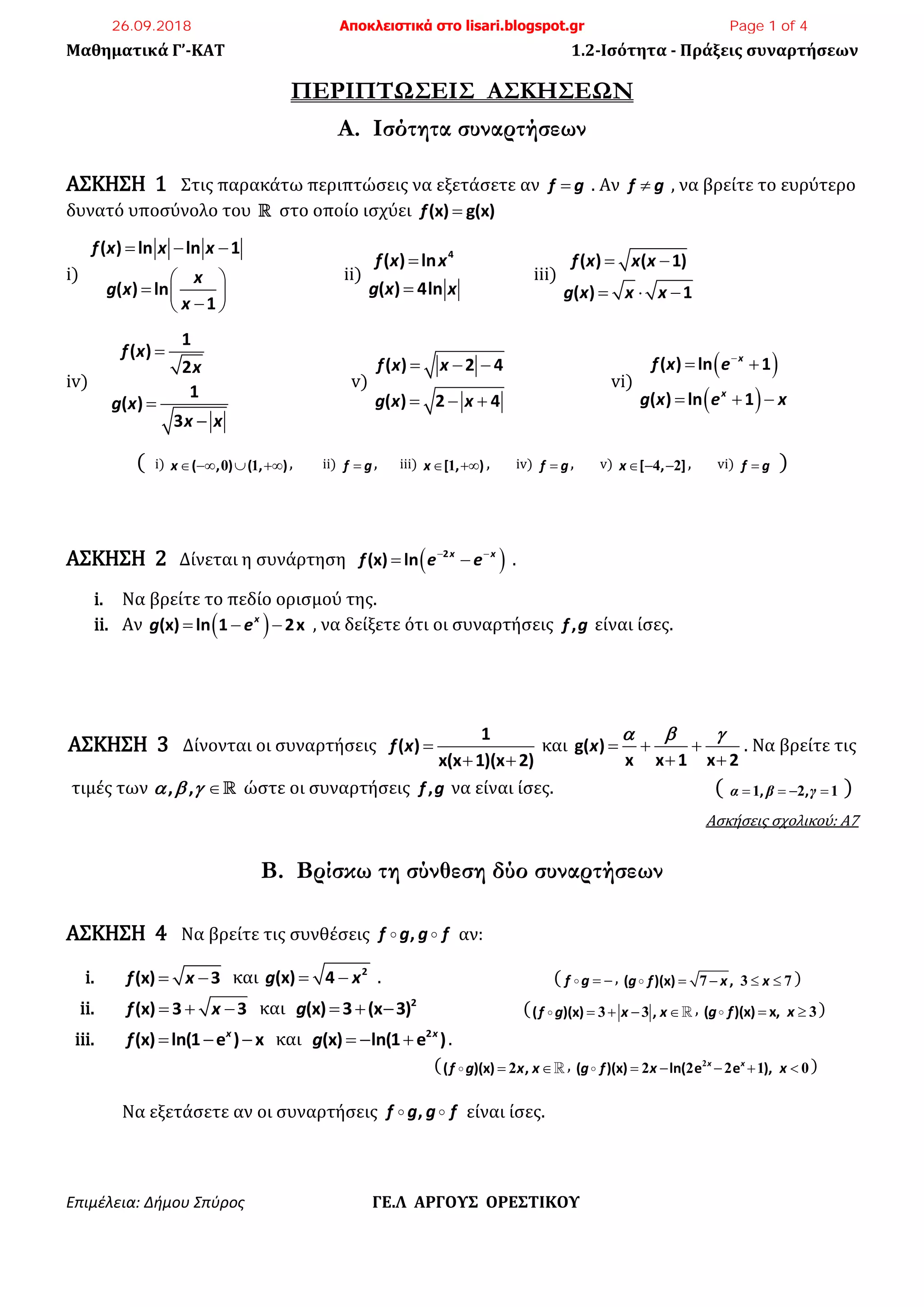 1.2: Ασκήσεις στην ισότητα και σύνθεση συναρτήσεων