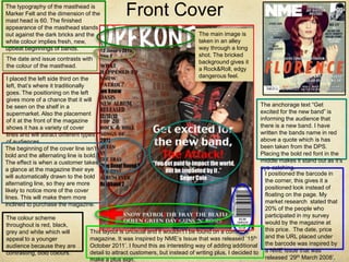 The document provides an evaluation of a magazine cover design created by Jaspreet Bhatoa, noting the typography used for the masthead, the placement of cover lines and images to draw the reader's eye, and the use of bold red, black, grey and white colors to appeal to a younger audience. Key elements of the design include the large masthead, a long shot main image in an alleyway to give an "edgy" feel, and alternating bold and plain text for the cover lines to increase noticeability and purchase inclination.