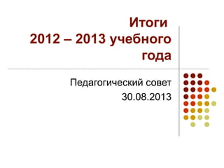 В учебном году 2012-2013 в основной школе обучалось 321 ученик, из которых 316 аттестованы, а успеваемость составила 98,4%. В 10-11 классах аттестованы 95 человек с качеством знаний 54,7% и успешностью 100%. Анализ итоговых аттестаций показал, что выпускники 11 классов достигли средних баллов выше, чем по региону по большинству предметов.
