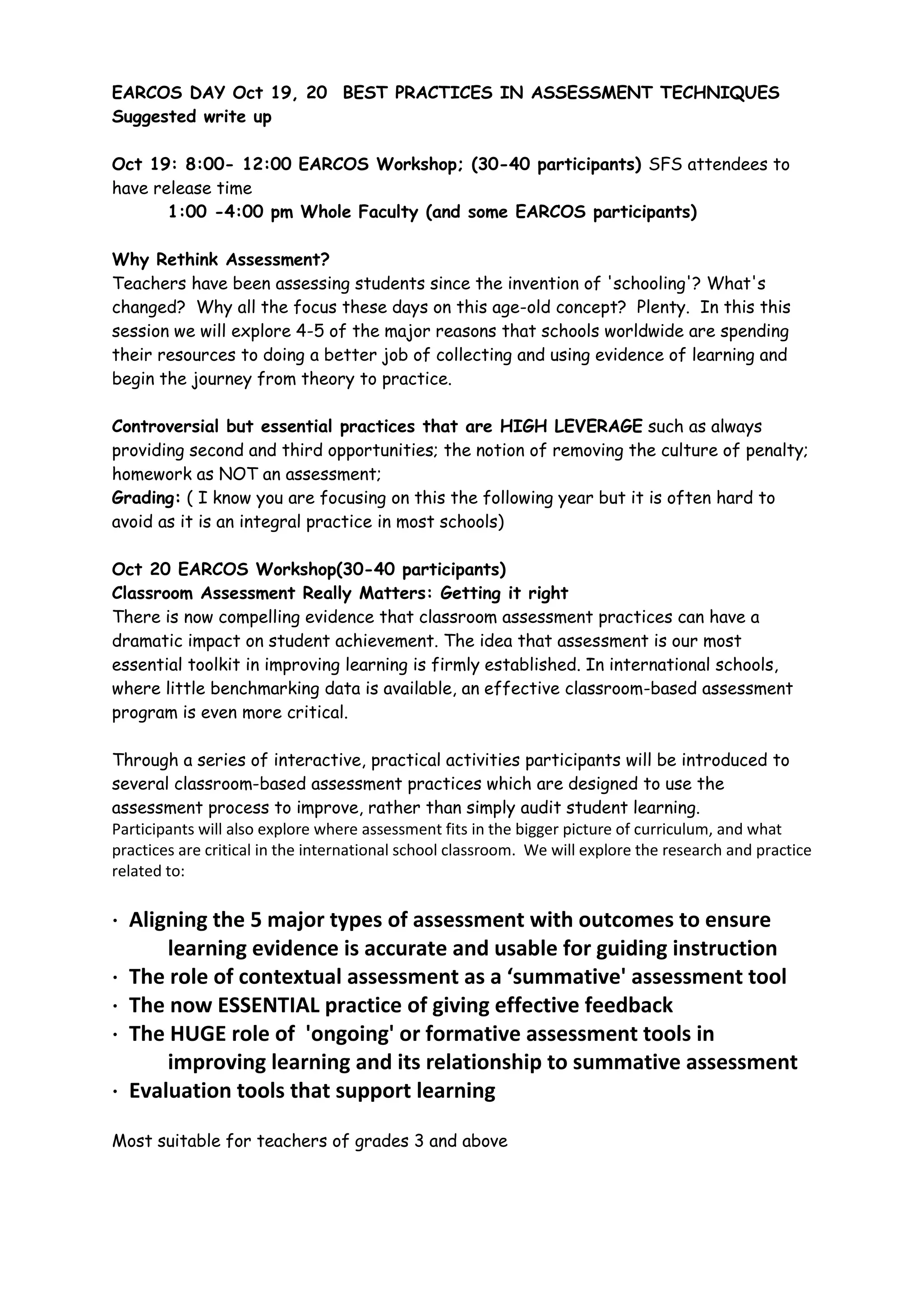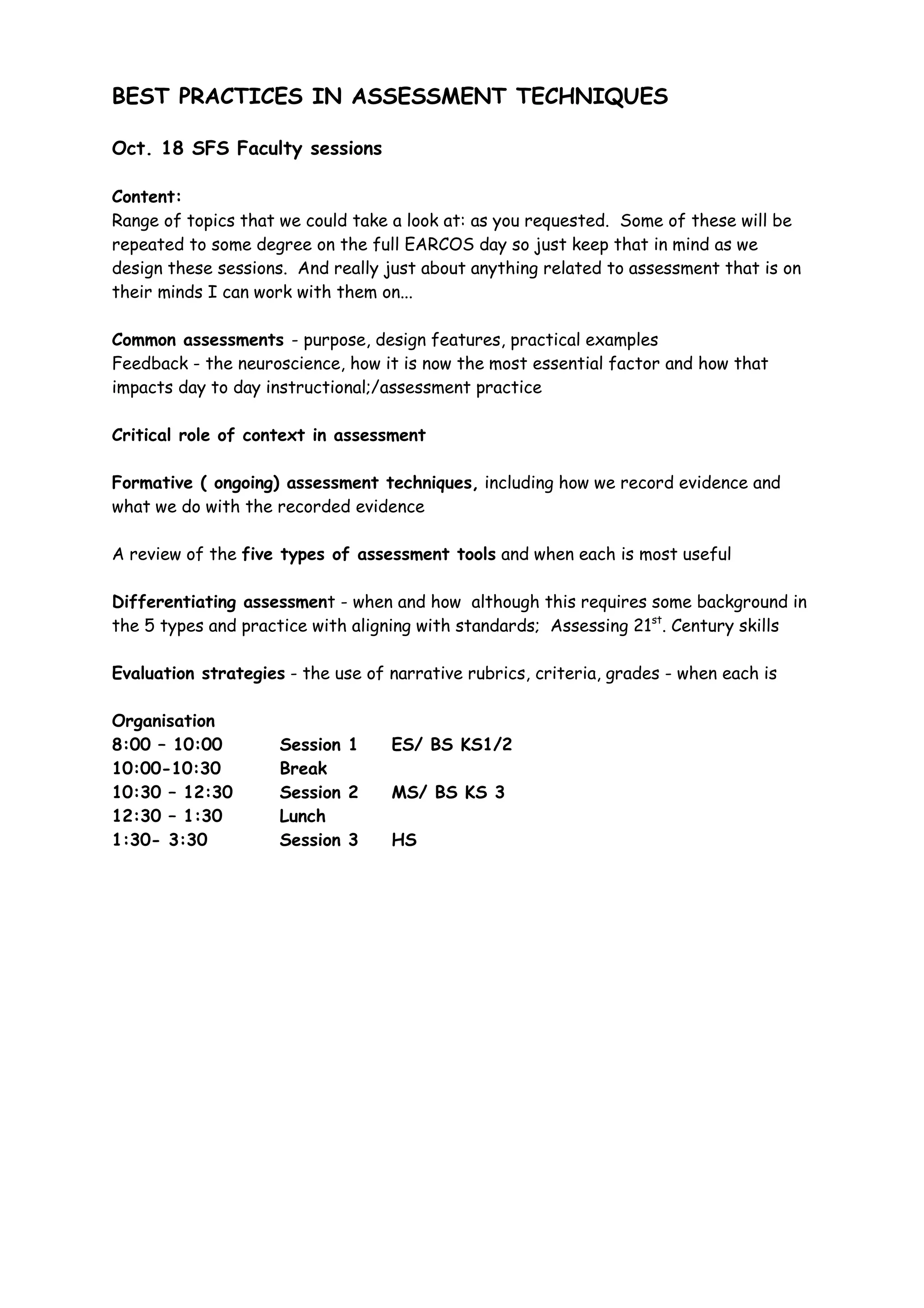 The document outlines the agenda for two faculty development sessions on best practices in assessment techniques. Session 1 will cover topics such as common assessments, the role of feedback, formative assessment techniques, and differentiating assessments. Session 2 will focus on why rethinking assessment is important given changes in schools, controversial practices like allowing retakes, and removing penalties from assessments. The document also provides an overview of an EARCOS workshop on making classroom assessment a priority and using it to improve student learning.
