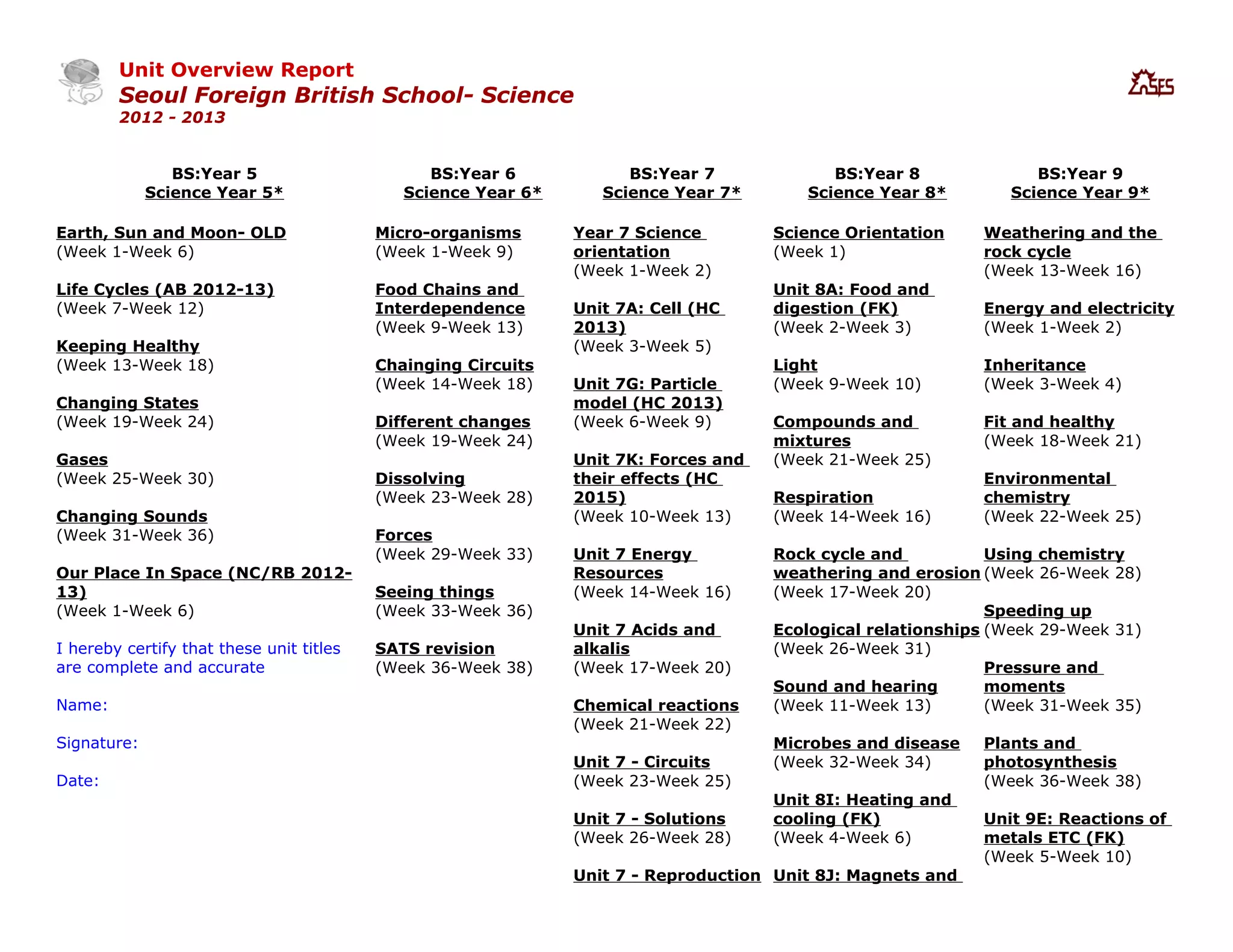 This document provides a unit overview report for the science curriculum at Seoul Foreign British School from 2012-2013. It lists the various science units taught each year from Year 5 through Year 9. Each year covers 6 units per academic year, focusing on topics like the earth, life cycles, forces, light, and chemistry. The report is certified by a teacher as being complete and accurate.