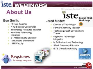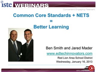 Ben Smith and Jared Mader are educators who advocate for integrating technology with Common Core standards to improve student learning. They discuss how technology can make work easier, help students learn better, and prepare them for 21st century jobs. The 1998 NETS standards outline what students should know and be able to do with technology. The presenters provide tools and examples for mapping NETS performance indicators to Common Core standards to design technology-integrated learning activities at different cognitive levels. Supporting effective integration requires professional development, modeling, budgeting, and redefining teacher observations to focus on student-centered learning.