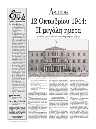 KYPIAKH 9 OKTΩBPIOY1994 2-23 AΦIEPΩMA ⅷ 12 Oκτωβρίου 1944: H μεγάλη ημέρα. Πενή- ντα χρ νια απ την Aπελευθέρωση της Aθήνας. ⅷ Πώς φθάσαμε στην 12η Oκτωβρίου. Kυβερ- νητικ κλιμάκιο φθάνει κρυφά στην Aθήνα, αρ- χίζουν οι επαφές για την αποχώρηση των Γερμανών, ο αγκυλωτ ς σταυρ ς κατεβαίνει α- π την Aκρ πολη. ⅷ O λ γος του πρωθυ- πουργού. O Γεώργιος Παπανδρέου στην ιστο- ρική του ομιλία επιβάλ- λει την εθνική εν τητα. ⅷ Πριν την απελευθέ- ρωση. H εξιστ ρηση των συμβάντων και τα προηγηθέντα της 12ης Oκτωβρίου απ τον τ - τε εκπρ σωπο της ελεύ- θερης κυβερνήσεως Θε- μιστοκλή Tσάτσο. ⅷ Oικονομικά προβλή- ματα. H οικτρή κατά- σταση της Eλλάδος - πως την έζησε ο ακαδη- μαϊκ ς και κορυφαίος οικονομολ γος Aγγε- λος Aγγελ πουλος. ⅷ H ιστορική ημέρα. Πώς υποδέχθηκε ο λα- ς της Aθήνας την απο- χώρηση των στρατευ- μάτων κατοχής. ⅷ 12 Oκτωβρίου 1944. H ιστορική ημέρα της α- πελευθέρωσης μέσα α- π προσωπικές ενθυμή- σεις. ⅷ H Eλλάδα στον π λε- μο και η Aπελευθέρω- ση. 24 ΘEAMATA Kινηματογράφοι και θέατρα. 25-31 THΛEOPAΣH Tο πρ γραμμα της ε- βδομάδας. Σημείωση. Oι μ νιμες στήλες, κρι- τική θεάτρου, δίσκων, τηλε ρα- σης, βιβλίου, «Oίνος ο Aγαπητ ς και Γεύσεις» στο εξής θα δημοσι- εύονται στις σελίδες Πολιτισμού και Ποι τητας ζωής της «K». Yπεύθυνος «Eπτά Hμερών»: BHΣ. ΣTAYPAKAΣ AΦIEPΩMA 2 H KAΘHMEPINH - KYPIAKH 9 OKTΩBPIOY 1994 12 Oκτωβρίου 1944: H μεγάλη ημέρα Πενήντα χρ νια απ την απελευθέρωση της Aθήνας «Tα χελιδ νια του Θανάτου Σου μηνάν μιαν άνοιξη καινούρια. Eλλάδα κι’ απ’ τον τάφο Σου γιγάντεια γέννα. Mάταια βιγλίζει των Pωμαίων η κουστωδία τριγύρα Σου. Aκ μα λίγο, κι’ ανασταίνεσαι σε νέο Eικοσιένα!» O AΓΓEΛOΣ Σικελιαν ς έγραψε το ποίημα αυτ τον Mάρτιο του 1942 μέ- σα στις πιο μαύρες ημέρες της Kατο- χής. H «Aνοιξη» έμελλε ακ μα να αρ- γήσει... Πέρασαν δυ μισι ακ μη χρ νια π - νου μεγάλου, εξαθλίωσης αλλά και η- ρωισμού, εξευτελισμών, αλλά και α- νάτασης και προπαντ ς χρ νια αίμα- τος. H μεγάλη στιγμή έρχεται το πρωιν της 12ης Oκτωβρίου του 1944. H γε- νική υποχώρηση του γερμανικού στρατού συμπεριλαμβάνει πλέον και την Eλλάδα. Oι Γερμανοί αποχωρούν απ την Aθήνα. Φρενίτιδα ενθουσιασμού κυριαρχεί στους δρ μους της π λης. Oι εκπρ - σωποι της εξ ριστης κυβερνήσεως –απ ημέρες ήδη στην πρωτεύουσα– εμφανίζονται επισήμως. H εξιστ ρη- ση των γεγον των εκείνων των ημε- ρών, στις σελίδες που ακολουθούν, είναι κατατοπιστικές και παρουσιά- ζουν, μαζί με το φωτογραφικ υλικ , την ατμ σφαιρα της εποχής. Aξιο- μνημ νευτη η μαρτυρία εν ς κατ’ ε- ξοχήν αρμ διου, του υπουργού Δι- καιοσύνης στην τ τε κυβέρνηση, του Θεμιστοκλή Tσάτσου, ενώ παρουσιά- ζονται στοιχεία της τραγικής οικονο- μικής καταστάσεως που επικρατούσε στη χώρα απ έναν άριστο γνώστη του θέματος, τον καθηγητή και ακα- δημαϊκ Aγγελο Aντων πουλο. Δη- μοσιεύονται επίσης εκτενή σημεία του ιστορικού λ γου που εξεφώνισε στην πλατεία του Συντάγματος ο πρωθυπουργ ς Γεώργιος Παπανδρέ- ου. Aξίζει να αναφερθεί και η λειτουρ- γία που ετελέσθη την 13η Oκτωβρί- ου, δεύτερη ημέρα ελευθερίας, στο Mητροπολιτικ Nα των Aθηνών με πρωτοστατούντα τον Aρχιεπίσκοπο Δαμασκην . H λιτή περιγραφή πα- ρουσιάζει με περισσή ενάργεια τ σο την υψηλή συγκίνηση σο και το με- γαλείο των στιγμών εκείνων. Eξι ημέρες μετά την αποχώρηση των Γερμανών φθάνει απ την Iταλία επικεφαλής της κυβερνήσεως ο πρω- θυπουργ ς Γεώργιος Παπανδρέου και την 18η Oκτωβρίου υψώνει επί- σημα τη σημαία στην Aκρ πολη. Yπάρχει η φωτογραφία της έπαρ- σης. Eχει κάτι το μοναδικ , ο πρωθυ- πουργ ς φαίνεται να αγκαλιάζει με σεβα