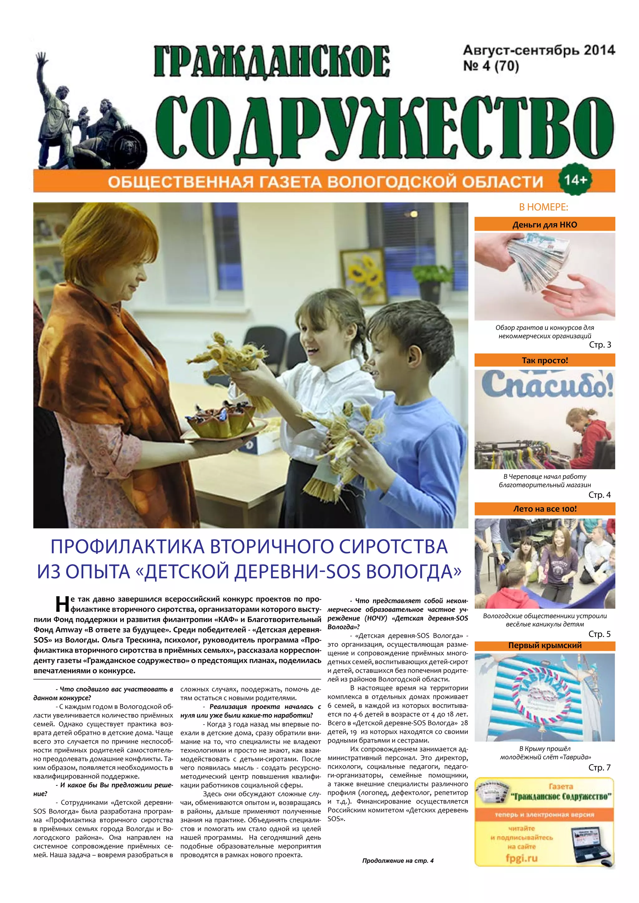 Документ освещает деятельность некоммерческих организаций в Вологодской области, включая проекты по профилактике вторичного сиротства и поддержке пожилых людей. Основные темы включают грантовые конкурсы, успешные инициативы, такие как открытие ветеринарного санатория для овчарок и программы активного образа жизни для пожилых граждан. Также представлены итоги научно-практической конференции по народным традициям и обсуждение международного грантового конкурса от Русской Православной Церкви.
