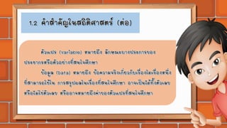 ค่าสถิติ (Statistic) เป็นค่าคงตัวที่พิจารณาจากข้อมูลของตัวอย่างโดยมี