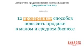 Документ описывает 12 проверенных способов увеличения продаж для малого и среднего бизнеса, включая такие методы, как искусственное завышение цен, использование зачеркнутых цен и предложение бонусов. Упоминаются также различные способы оплаты, обработки возражений, партнерского маркетинга, коммерческих предложений, отзывов и создания уникальных торговых предложений. Основная цель этих методов - привлечь клиентов и значительно повысить прибыль.