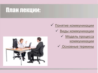 Документ описывает основные аспекты коммуникации как процесса управления, включая определения, виды и модели. Рассматриваются вертикальные и горизонтальные коммуникации, а также формальные и неформальные. Важные термины, такие как отправитель, кодирование и обратная связь, также объясняются для понимания процесса коммуникации.