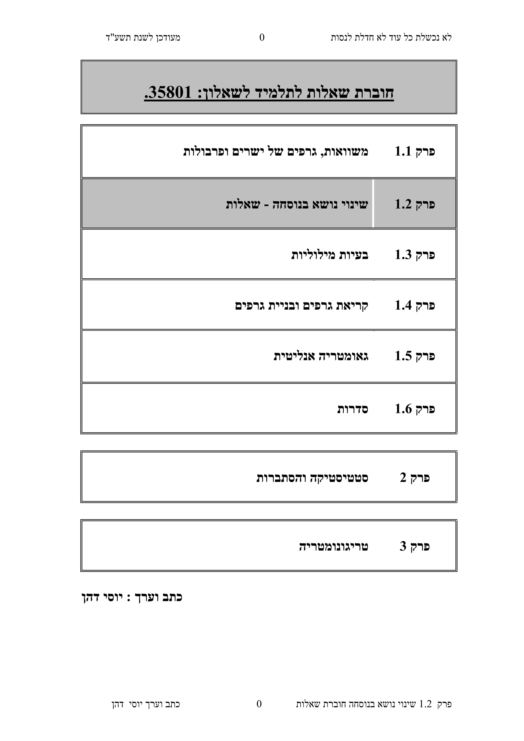 עוד כל נכשלת לאמעודכן"תשע לשנתד פרק1.2בנוסחה נושא שינוישאלו חוברתת0יוס וערך כתבידהן 0 חוברתשאלות:לשאלון לתלמיד10853. פרק3.3,משוואותופרבולות ישרים של גרפים פרק3.1בנוסחה נושא שינוי-שאלות פרק3.1מילוליות בעיות פרק3.1גרפים ובניית גרפים קריאת פרק3.0אנליטית גאומטריה פרק3.1סדרות פרק1סטטיסטיקוהסתברות ה פרק1טריגונומטריה דהן יוסי : וערך כתב