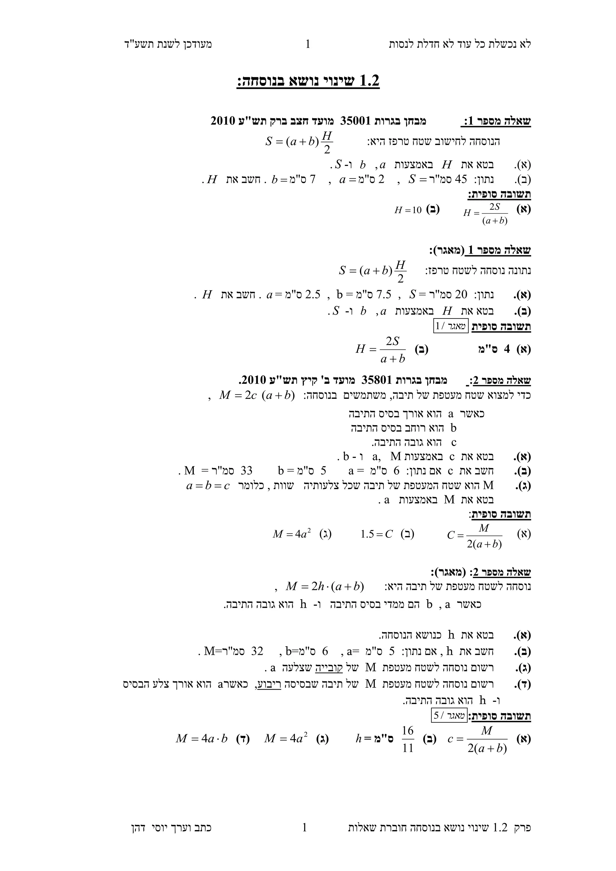 פרק 1.2 מאגר: שינוי נושא בנוסחה - פתרונות