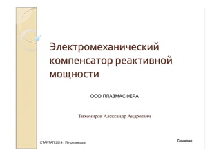 Документ описывает проект по разработке электромеханического компенсатора реактивной мощности, направленный на снижение потерь активной энергии в электросетях. Проект выделяет преимущества своего устройства, такие как плавная регулировка реактивной мощности и улучшение качества электроэнергии, а также описывает необходимые расчёты и стоимость. Указано, что финансирование требуется в объёме 20 миллионов рублей для проведения научных исследований, развития производства и выхода на рынок.